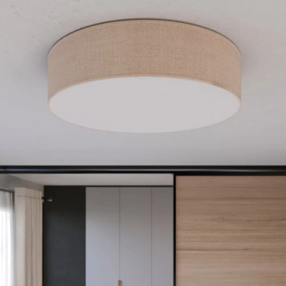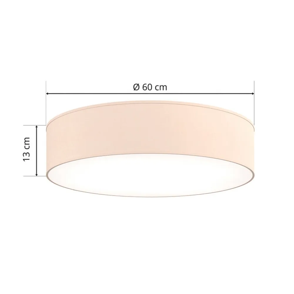 Loftlampen Rondo i beige tekstil forener tidløst design med funktionel belysning. Den elegante tekstilskærm sikrer en jævn og blød lysfordeling, der giver ethvert rum en varm og indbydende atmosfære. Den diskrete beige farve passer perfekt ind i forskellige indretningsstilarter og er en alsidig løsning til belysning af stuer og soveværelser.