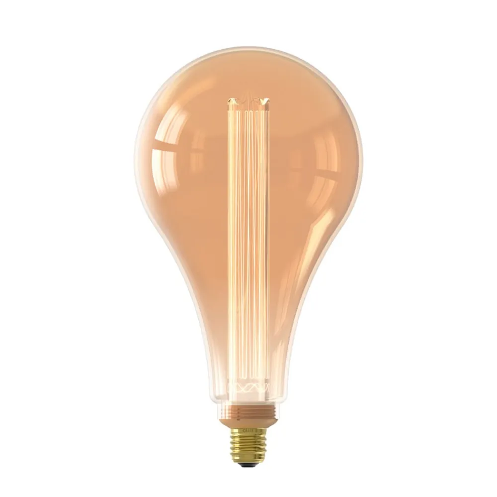 Dæmpbar LED-lampe XXL Royal Osby Filament med gyldent skær, 3,5 W, 1.800 K Elegante filamenter er kernen i Royal Osby LED-lampen. Royal-serien er en kollektion af elegante, store lamper, der tilfører ethvert rum et luksuriøst look og udtryk. Lamperne i XXL-format har en statelig, lige glødetråd, der giver et smukt lys og passer perfekt til et elegant interiør. Med en særlig varm lysfarve skaber denne elegante lampe en meget behagelig atmosfære. Guldbelægningen sikrer, at denne moderne E27-lampe passer ind i næsten ethvert interiør. Osby er et slående højdepunkt, der kan være omdrejningspunktet i et rum og udstråler en følelse af storhed og raffinement. Med Royal Osby eller en af de andre lamper fra Royal-serien fra Calex er du garanteret at give dit interiør et særligt luksuriøst look. – dæmpbar