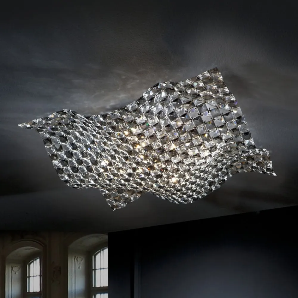 Korpusset i loftlampen Saten dannes af et bølgeagtigt gitter i kromskinnende metal, der rummer et stort antal klare og røgfarvede K9-krystaller, som tilsammen bevirker et fascinerende lysspil. Dermed bliver Saten en lysbegivenhed, som der ikke er set magen til, når det gælder elegance og skønhed.