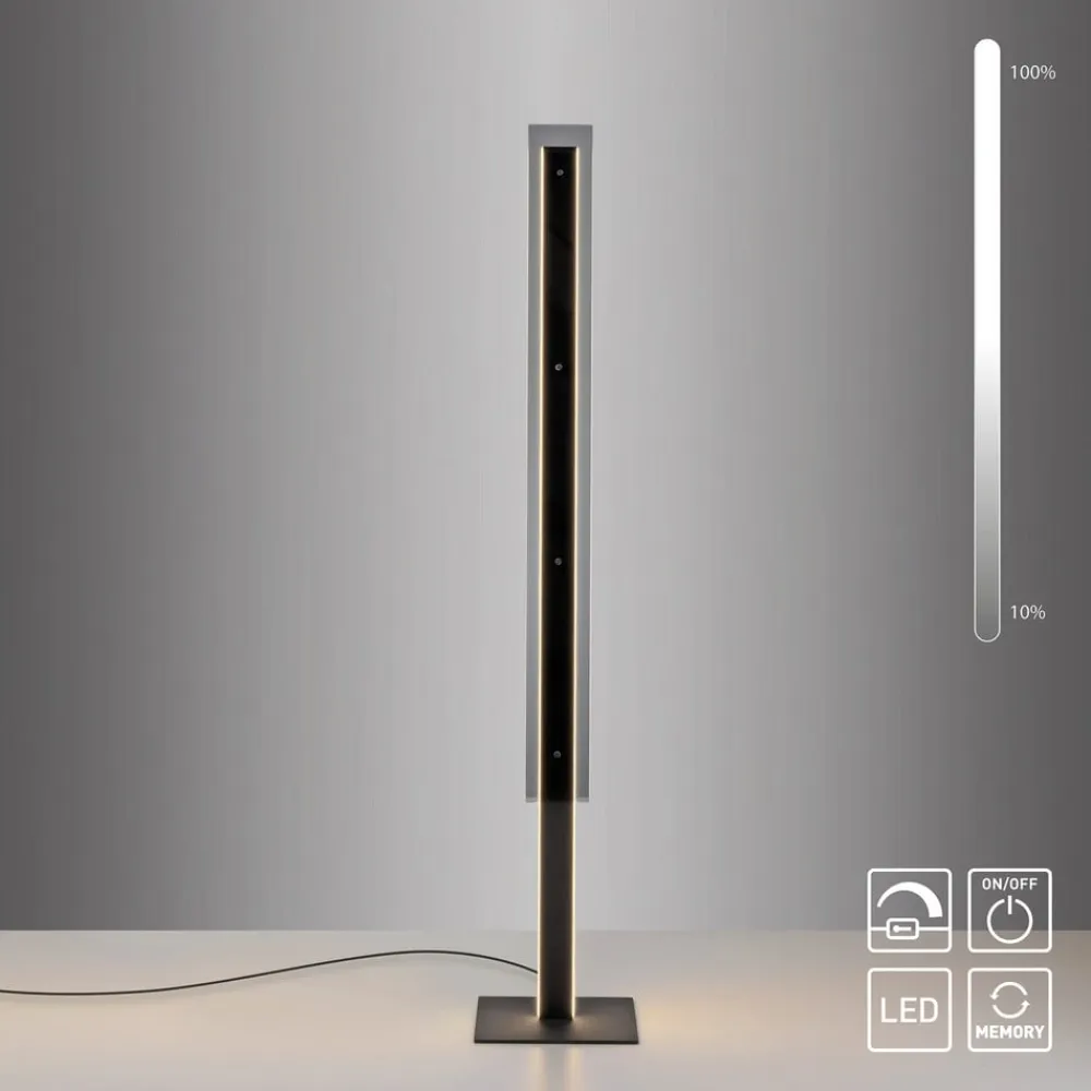 LED-gulvlampen Lena fra SCHÖNER WOHNEN-kollektionen forener moderne funktionalitet med et elegant design og bringer stilfuld belysning ind i rummet. Med sin sorte overflade, røggråtonet glas og klare linjer passer den særligt godt ind i moderne indretningsstilarter – enten som en smuk ekstra lampe i stuen, som læselampe eller som et visuelt highlight i spisestuen. Lampe er udstyret med et LED-kort og afgiver et behageligt varmhvidt lys, der skaber en hyggelig og indbydende atmosfære. Takket være snordæmperen kan lysets lysstyrke reduceres trinløst, så belysningen kan tilpasses det aktuelle lysbehov. Hukommelsesfunktionen gemmer den sidste indstilling, indtil lampen tændes igen. LED-gulvlampen Lena er det perfekte valg for alle, der ønsker at kombinere formskøn elegance med praktisk funktionalitet.