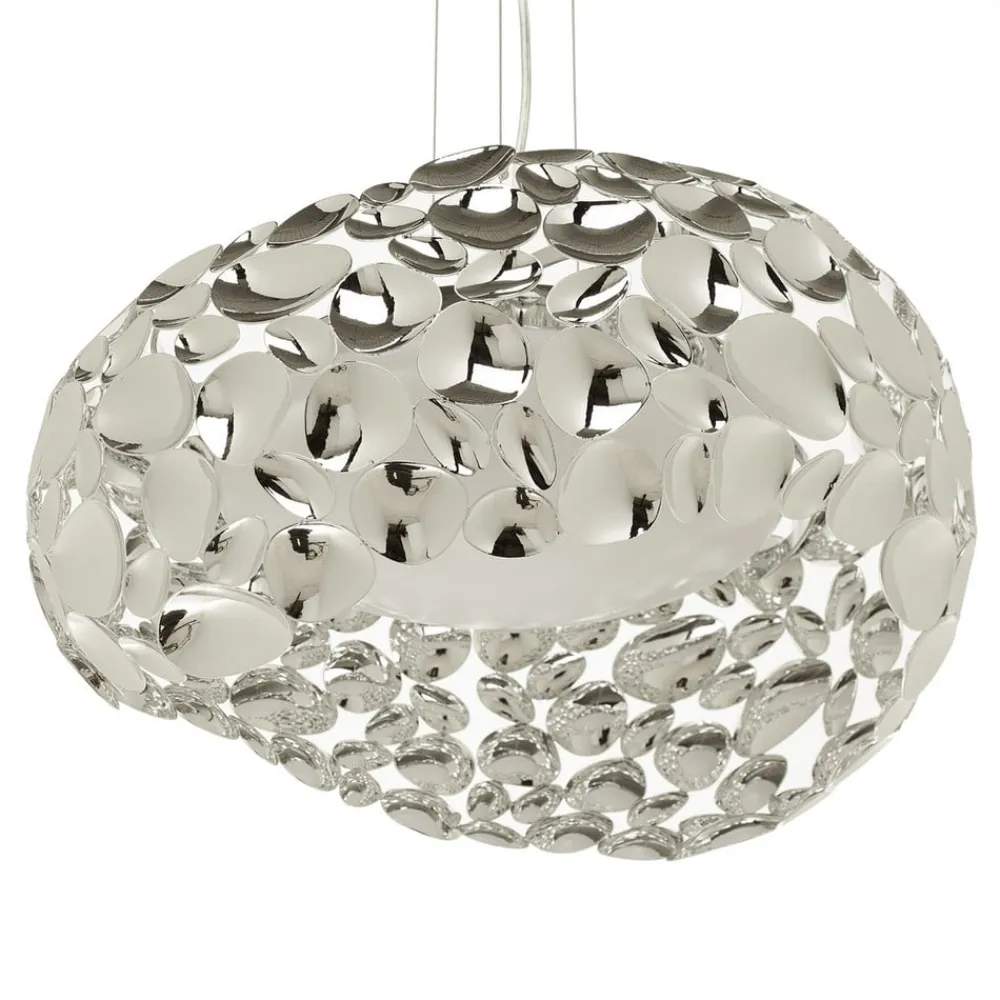 Uregelmæssigt formede, hovedsageligt ovale metalelementer med forkromet overflade er hos LED-hængelampen Narisa placeret efter hinanden på række for at danne en usædvanligt formet lampeskærm. På den måde opstår der en fortryllende konstruktion, der – i lige gyldigt hvilket rum – bliver til midtpunktet. Pærerne sidder bag en diffusor af hvid akryl. Dermed formår de at afgive et jævnt fordelt lys nedad, mens de utallige mellemrum i skærmen og spejlingerne af lyset i de bølgende elementer hele vejen rundt får flotte lyseffekter til at opstå på vægge og indretningsgenstande.