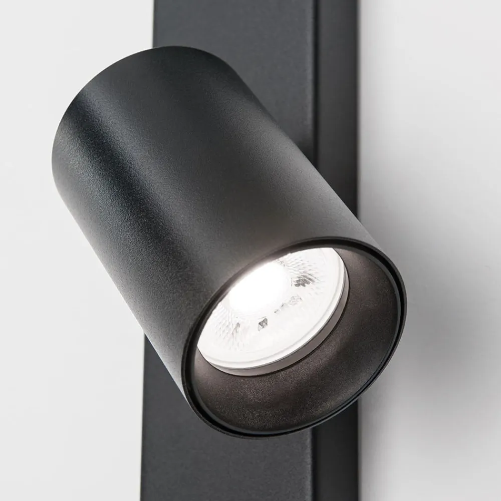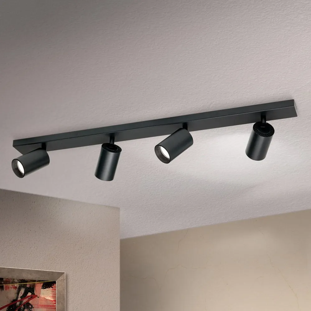 De fire lyskilder er monteret side om side i træk på den smalle, langstrakte baldakin . Den matsorte overflade og de få detaljer gør rampelyset til et iøjnefaldende, diskret belysningselement, som alligevel er moderne og praktisk. De fire lyskilder kan drejes og drejes efter behov, hvilket sikrer optimal justering af lysstrålen. Objekter og områder kan belyses direkte og specifikt efter behov.