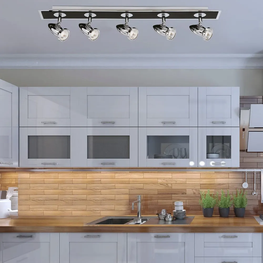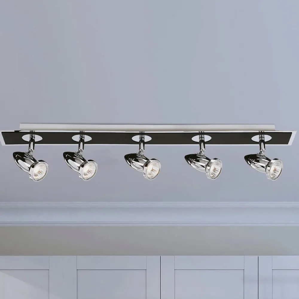 Med denne loftlampe kan man belyse store arealer i rum, for hver af projektørerne, der forsynes med halogenpærer, kan justeres efter behov, så lyset når ind i den ønskede krog i rummet. En loftlampe i topklasse og med meget moderne udstråling!