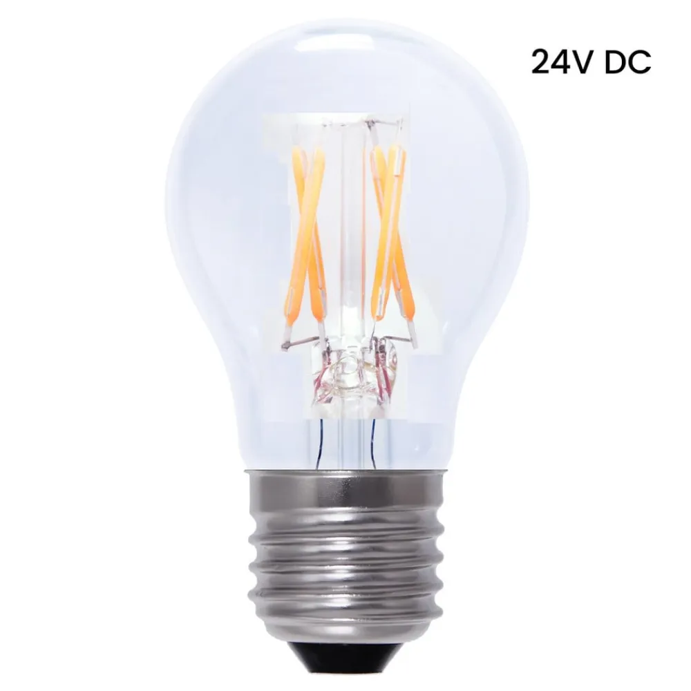 LED-filamentpære E27 3W 2.700K dæmpbar til 24V-netforsyning Denne LED-pære med klart glas og synlige LED-filamentpærer er en del af Segulas Nautic Line og er specielt udviklet til brug i 24V-netforsyningen. Den kan bruges direkte på f.eks. husbåde, i autocampere eller campingvogne uden brug af en omformer og giver varmhvid belysning. Pæren er udstyret med ambient dimming, så farvetemperaturen falder, når man dæmper (2.700 K – 2.000 K). OBS: Pæren kan ikke bruges i 230V-nettet.