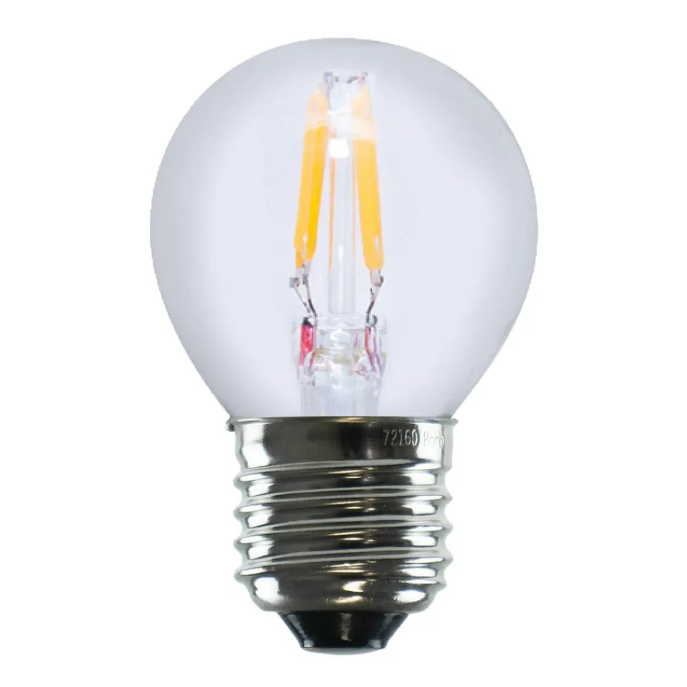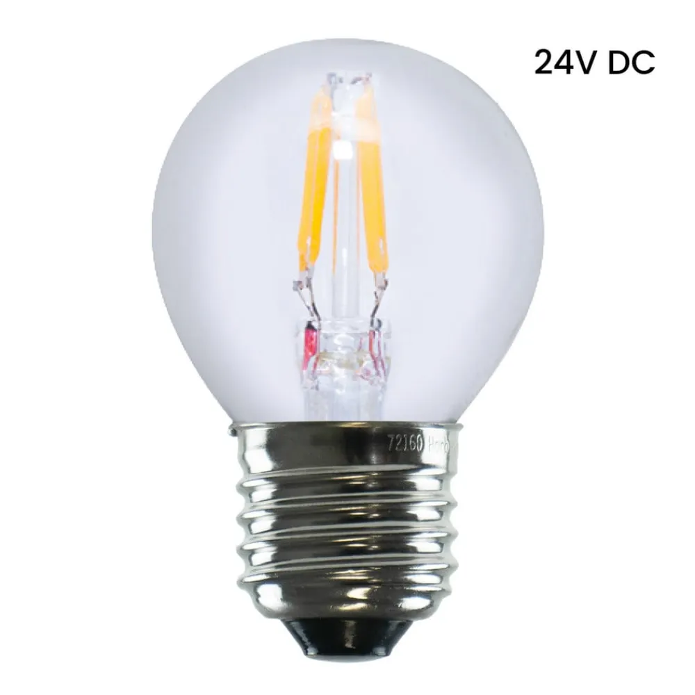 LED-lampe E27 24V 3W 2.700K glødetråd, dæmpbar Denne LED-pære fra Segula er udviklet til brug i 24V-nettet. Den lille filamentpære i form af en golfbold oplyser f.eks. autocampere eller husbåde med varmhvidt lys og kan dæmpes, hvilket giver et særligt stemningsfuldt lys takket være ambient dimming (2.700 K – 2.000 K). Pæren er ikke egnet til brug i 230V-nettet.