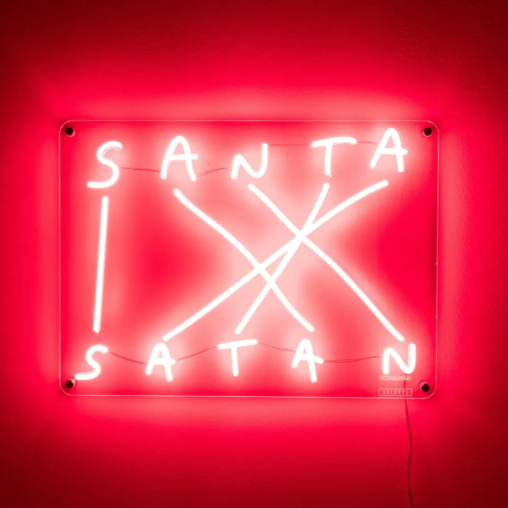 LED dekorativ væglampe med anagram “Santa-Satan”, røde LED-lysstrimlerEt strålende eksempel på brugen af de stilistiske anagrammer og antonymer er repræsenteret af denne LED-væglampe. “Santa-Satan” er udstyret med røde LED-silikone-rør, der repræsenterer de førnævnte udtryk, som er modsætninger, men som alligevel er dannet af identiske bogstaver. LED-strimlerne er fastgjort af en klar akrylplade. LED-væglampen er designet i stil med farverig neonbelysning og er ideel til dekorativ interiørbelysning – Udstyret med stikkabel og lysdæmper – Design by Nico Vascellari, Codalunga & Seletti