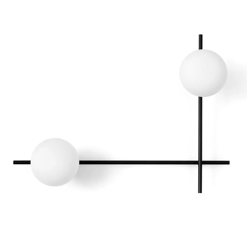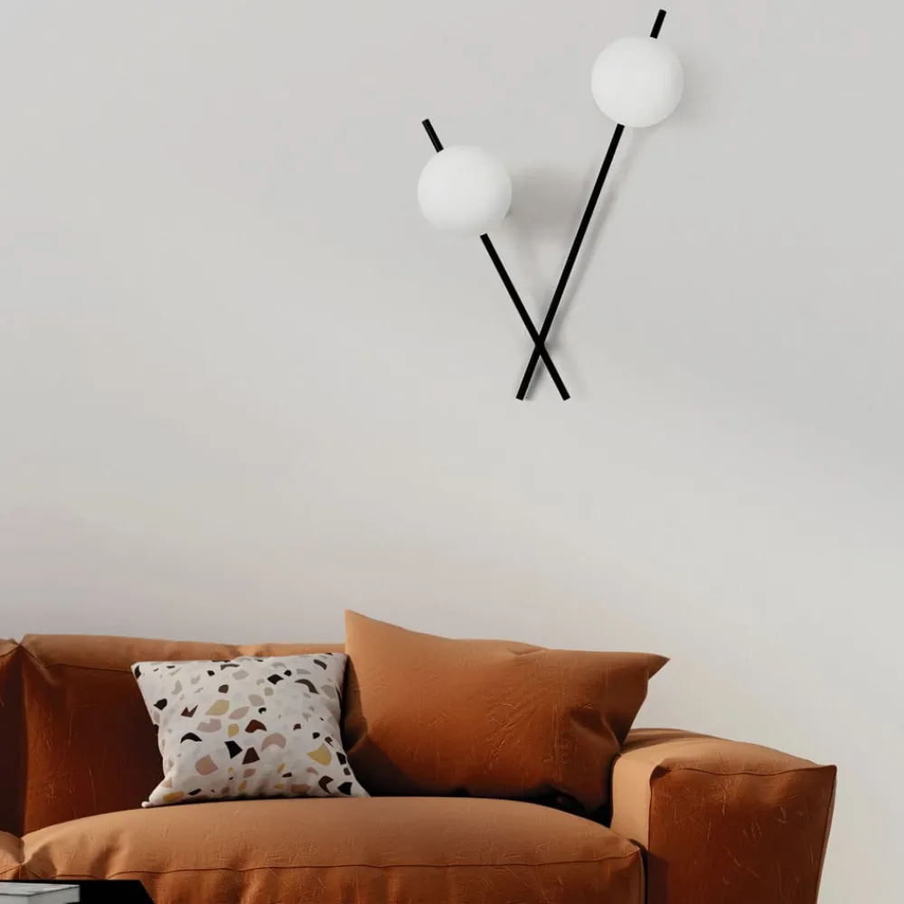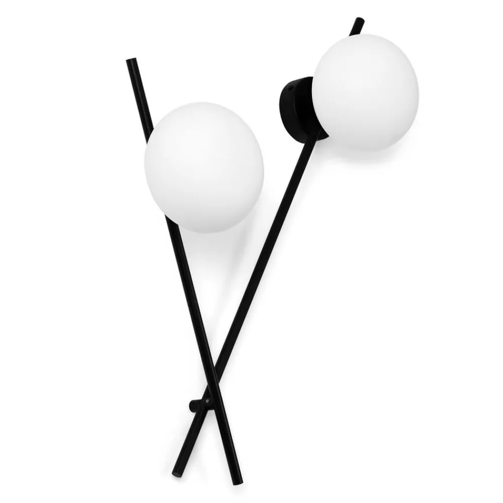 Væglampe Mikado med to kugleformede glasdiffusorerVæglampen Mikado med sit moderne design fanger straks beskuerens blik, selv når den er uoplyst. Armaturet består af to sorte, pulverlakerede metalstænger i soft-touch-finish og to diffusorer af mælkehvidt blæst glas. Ved at dreje på den sekundære arm kan armaturet flyttes til den ønskede position, mens den anden arm forbliver stiv. Glasset skaber en omfattende rumbelysning med en blød karakter. Farvesammensætningen i sort og hvid ser meget elegant ud og passer ind i moderne boligområder.Denne lampe kommer fra produktserien Miloox fra Sforzin, som er kendetegnet ved usædvanligt frisk design og kombinationen af trendy materialer.