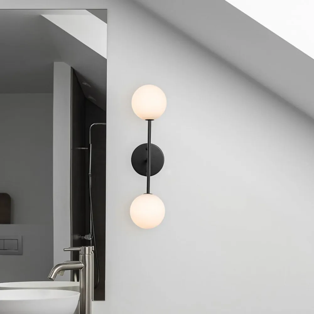 Elegant LED-væglampe Sigma, to lys Sigma-væglampen kommer i et minimalistisk design med 2 lyskilder i opalglas og en matsort metalramme. Den er fugtbestandig (IP23-klassificering) og passer derfor rigtig godt på badeværelset. Da glasset er håndlavet, kan der lejlighedsvis være luftbobler i glasset og en vis uregelmæssighed i glastykkelsen. To pærer (LED G9) er inkluderet i leveringsomfanget.