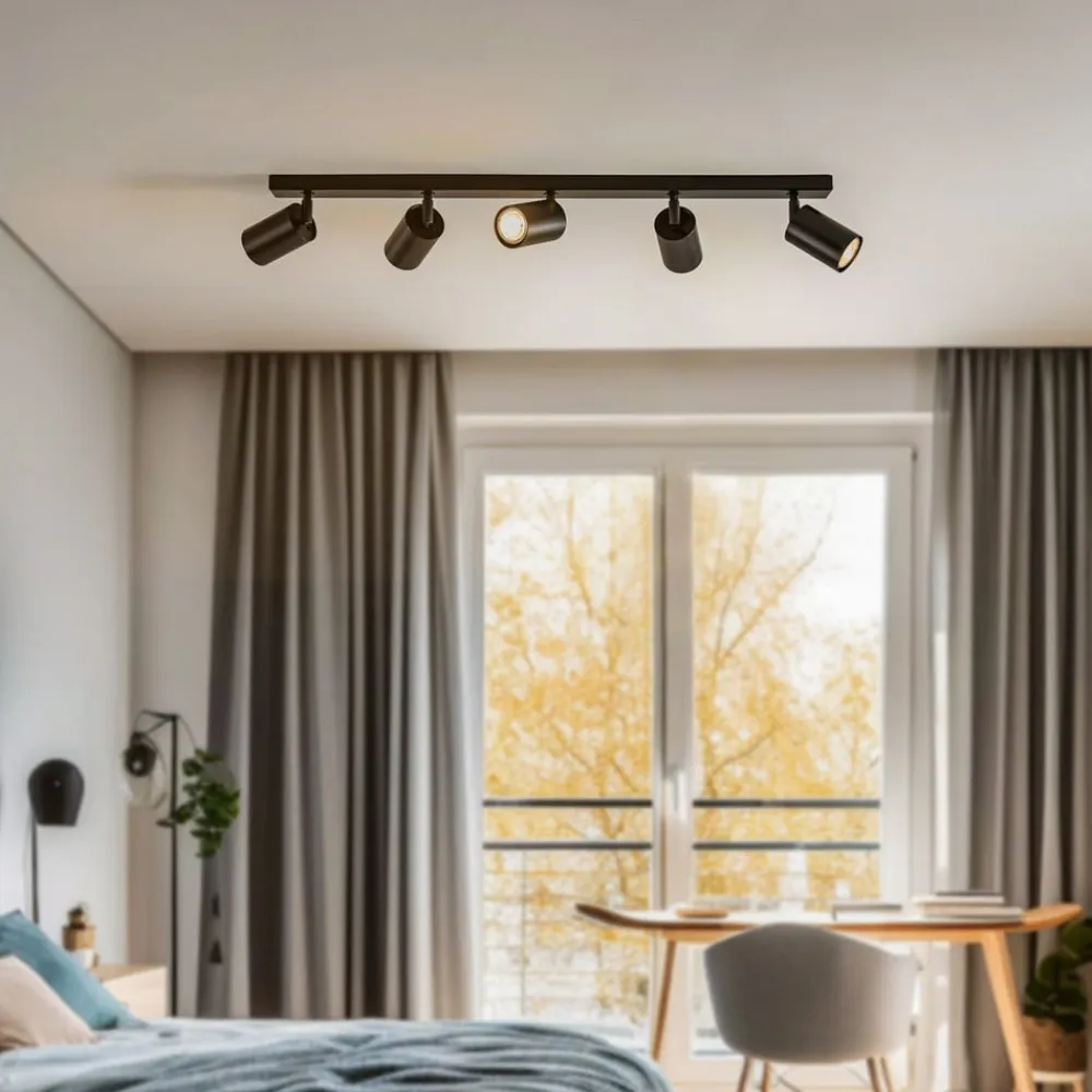 Loftspot Zoom, 5 lyskilder, i elegant sort, forener moderne design med funktionel alsidighed. Fremstillet af højkvalitetsstål passer denne spotlight perfekt ind i forskellige boligområder som stue, entre, køkken og spisestue. De klare linjer og den stilfulde farve gør den til et blikfang i ethvert rum.