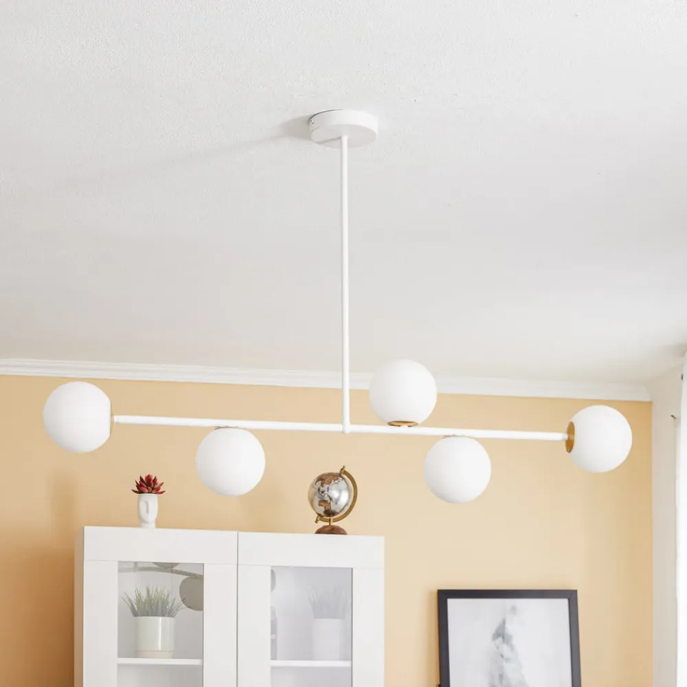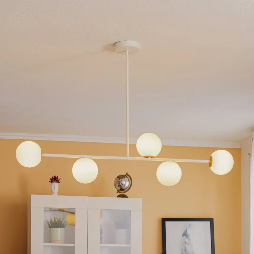 Hængelampen Gama 5 overbeviser med sin moderne stil og en imponerende kombination af pulverlakeret stål og glas. Denne lampe med 5 lyskilder i hvid og guld passer perfekt ind i forskellige boligområder som stuen, køkkenet eller spisestuen og skaber en harmonisk atmosfære. Den høje kvalitet og det europæiske design understreger eksklusiviteten af dette belysningsobjekt.