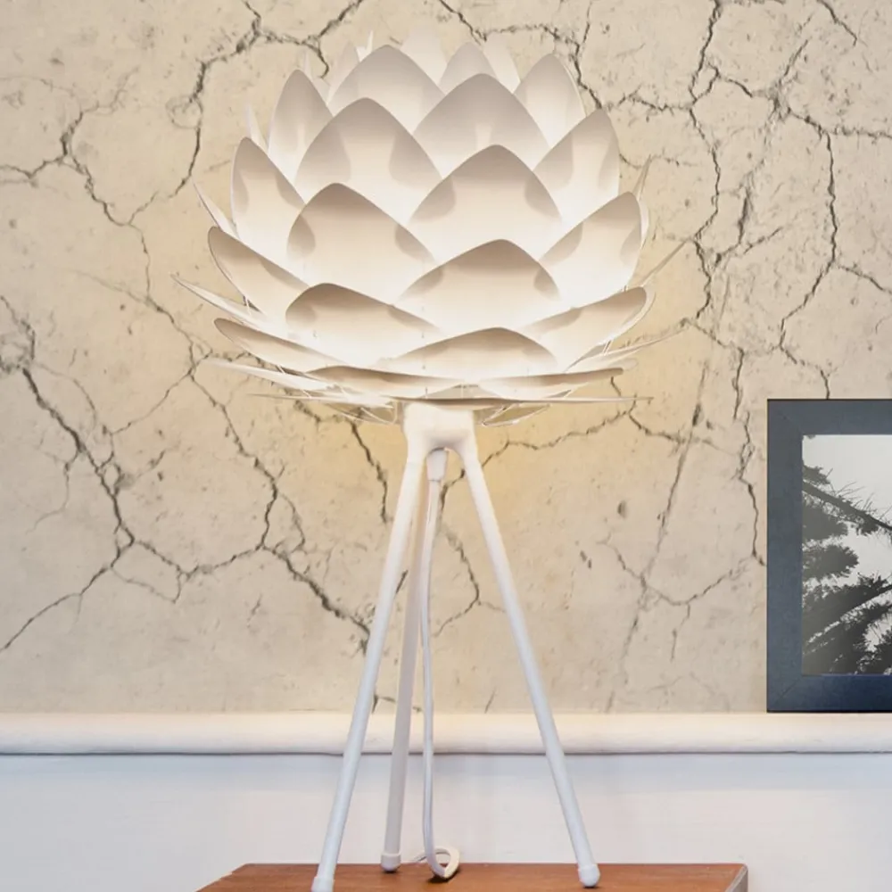 Den neutrale farvekombination i hvid forhindrer ikke at bordlampen Silvia mini er iøjnefaldende, idet skærmen i robust plast minder om en eksotisk frugt, hvilket ikke mindst skyldes de overlappende trekantede blade. Du kan vælge om skærmen skal monteres opad eller nedad.