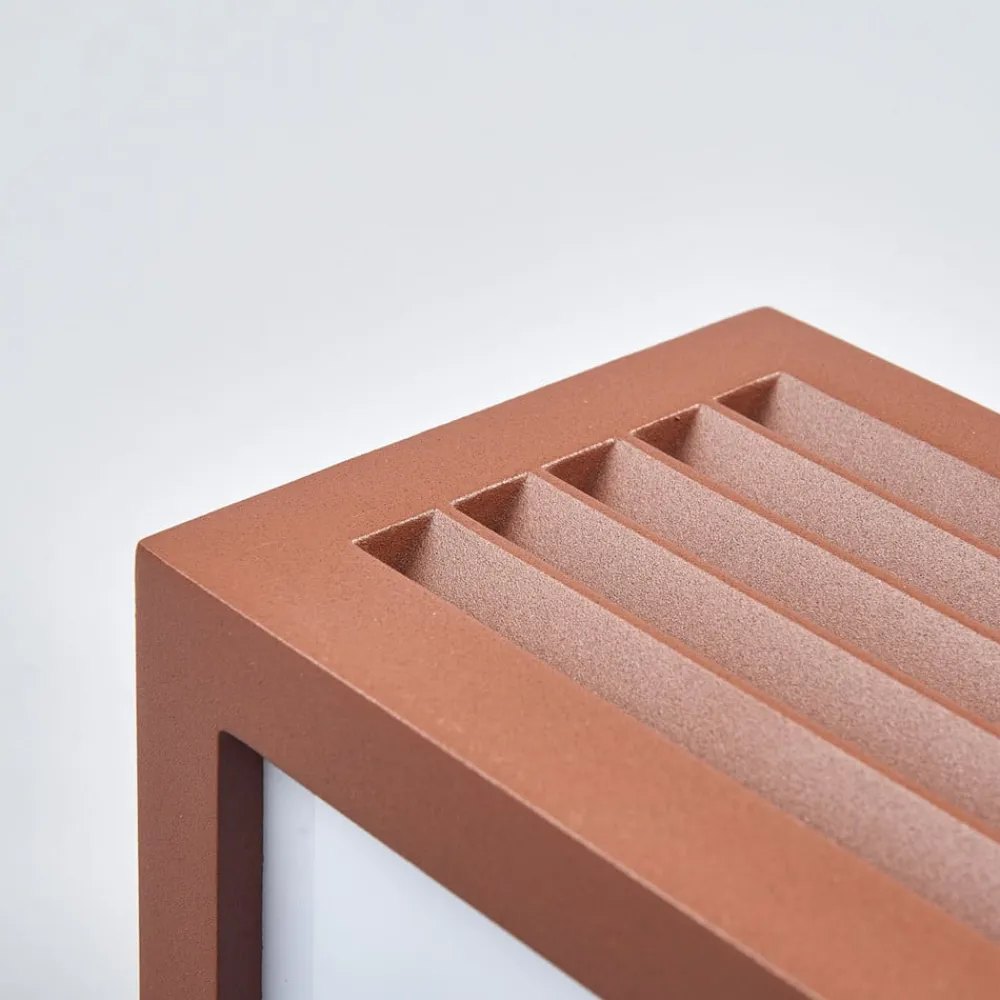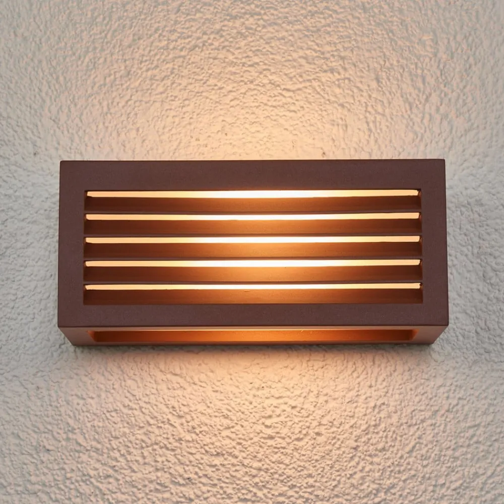 Rustbrun Box L udendørs væglampe – udsender spotlight på tre sider Alsidig, moderne og energibesparende – Box L-væglampen af aluminium i rustbrun passer til næsten enhver udendørs væg og udsender lys på tre sider. De påsatte lameller på forsiden giver ikke kun et flot udseende, de bløder også lyset op og sikrer blændfri belysning. Væglampen kan udstyres med pærer på op til maks. 18 W og op til en maksimal længde på 17,5 cm.