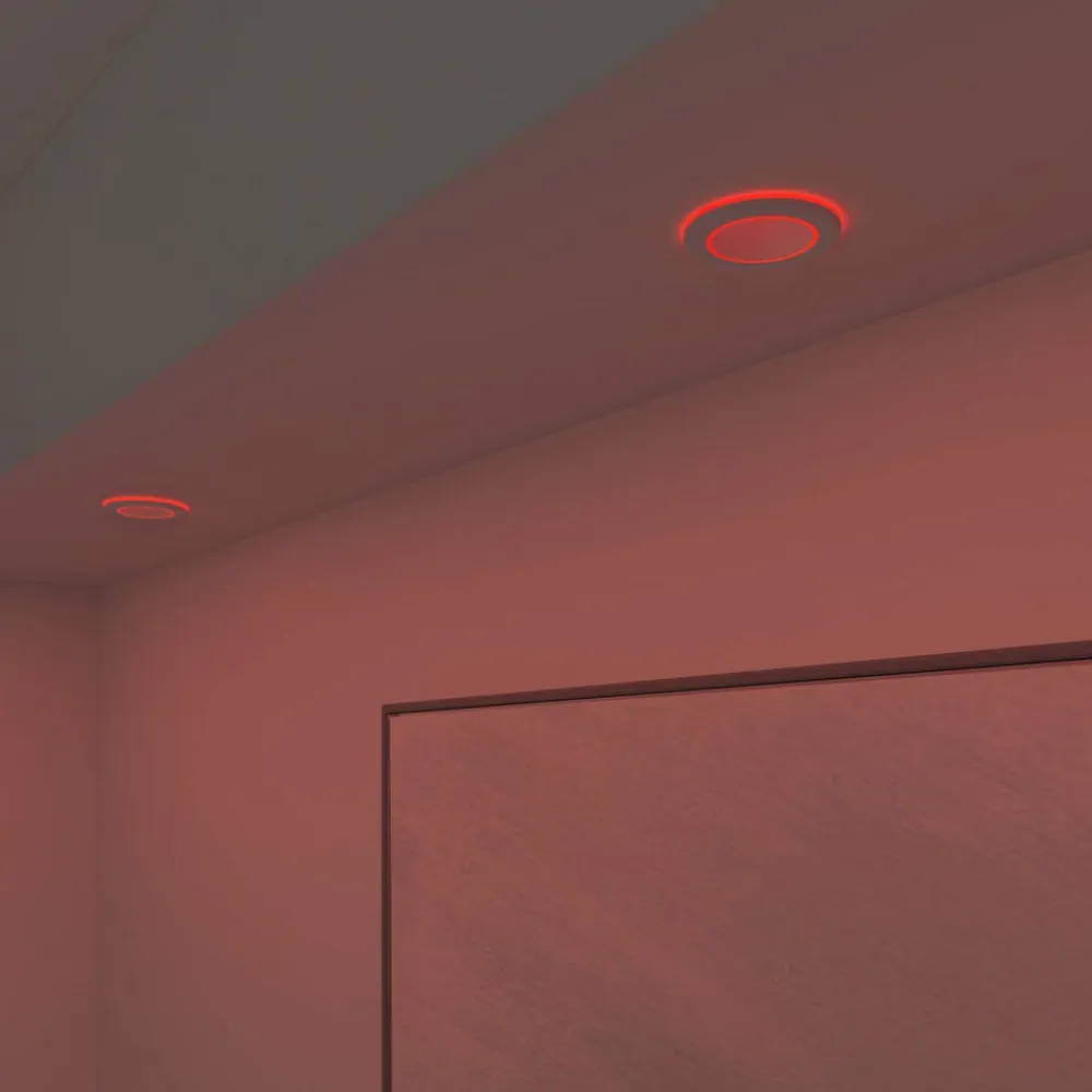 LED forsænket loftlampe Smart Halo Downlight med separat styrbart RGB-lys, IP44, CCT LED-downlight Smart Halo Downlight udsender hvidt lys direkte nedad. Farvetemperaturen kan justeres fra varmhvid (2.700 K) til dagslys (6.500 K). Derudover er der installeret ringformede LED’er omkring lysudtaget og bagud mod loftet, som kan lyse i farvede lysfarver. Begge lyskilder kan styres separat. Dette er muligt ved hjælp af den gratis Calex-app via en WLAN-forbindelse og også med stemmekommandoer. Den respektive intensitet kan også dæmpes, og begge lyskilder kan tændes og slukkes separat efter behov. Smart Halo Downlight er lavet af plast og er beskyttet mod stænkvand, så den også kan bruges i beskyttede udendørs områder. Tekniske funktioner / kompatibilitet – Kan styres via Calex-appen (gratis til Android og iOS) – Justerbar farvetemperatur for hovedlyset: varmhvid (2.700 K) – dagslys (6.500 K) – ekstra RGB-lys (over 100 lysfarver kan vælges) – timer og forudindstillede scener kan justeres via app – stemmestyring mulig med Amazon Alexa, Google Assistant og Siri Shortcuts – lyskilder kan dæmpes separat via app eller stemmekommando – WiFi 2,4 GHz – beskyttet mod stænkvand
