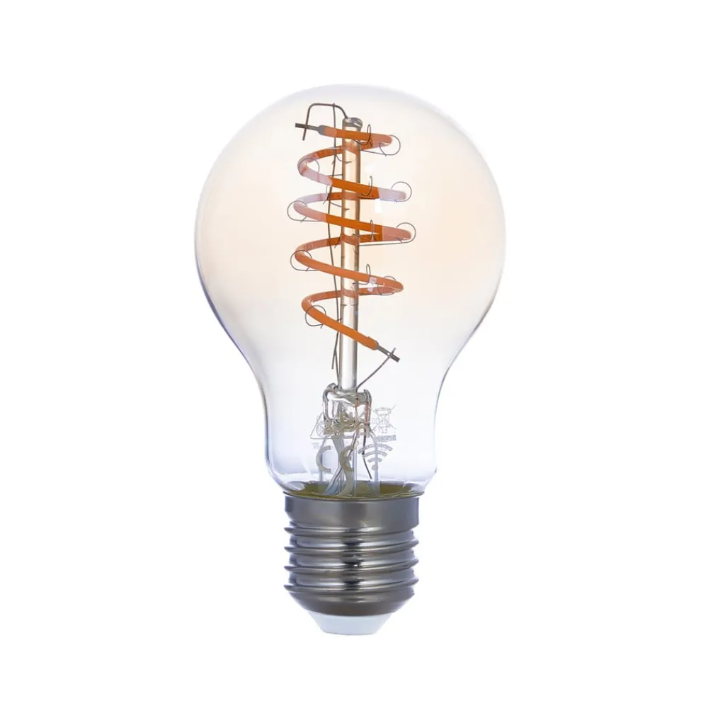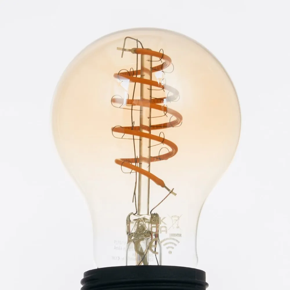 Filamentpære med E27-fatning og ravfarvet overflade – kan styres via WLAN og Tuya-appen Den genererer desuden en varmhvid (2.500 K) lysfarve og skaber en hyggelig atmosfære. Derudover er stemmestyring mulig ved hjælp af Amazon Alexa eller Google Assistant.