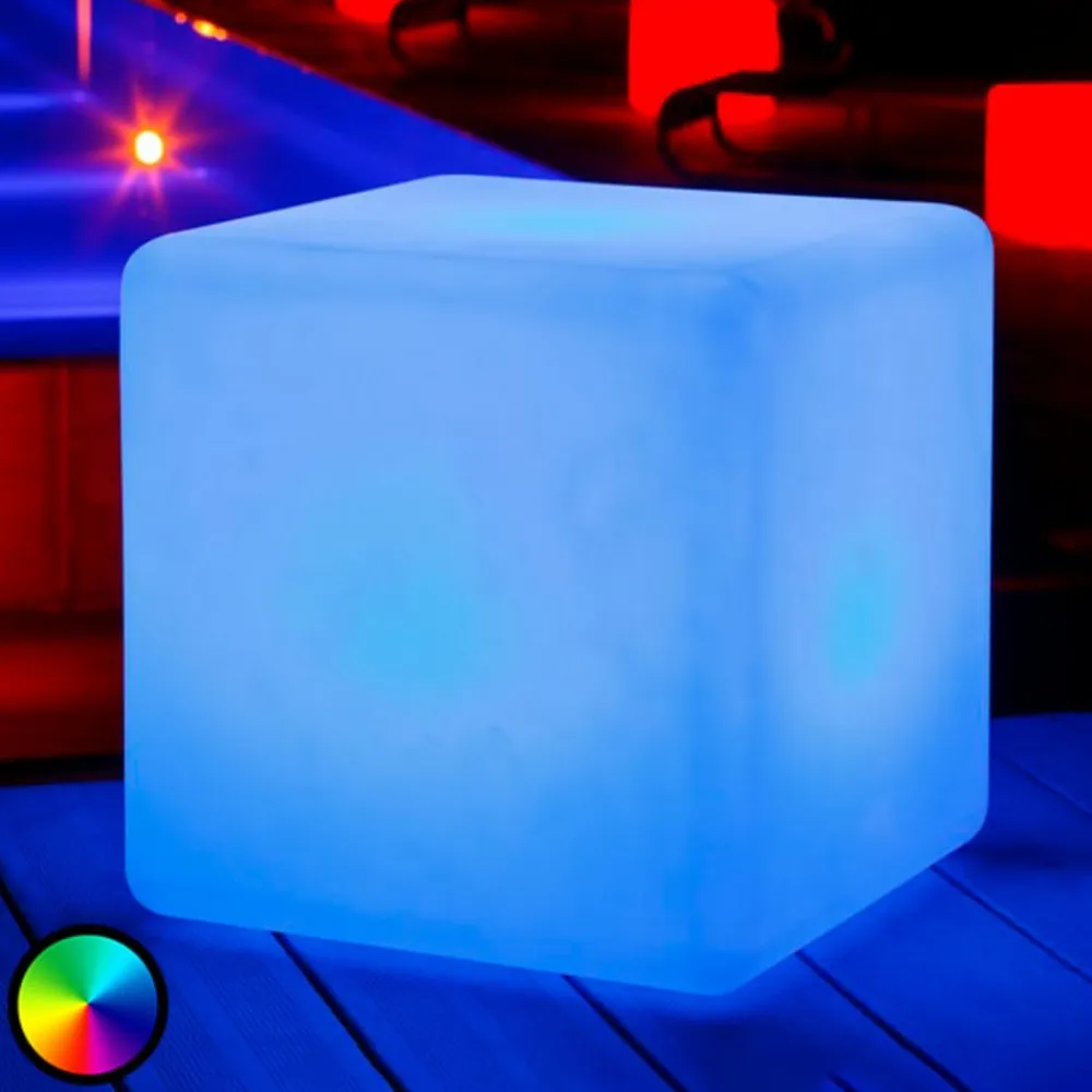 Big Cube – LED-lyskilde, skammel eller bord til udendørs brug Den oplyste kube Big Cube drives af et genopladeligt batteri, så den kan placeres overalt, uanset om der er en stikkontakt eller ej. Den aftagelige lysenhed gør det meget nemt at genoplade det tomme batteri ved at placere lysenheden på den medfølgende ladestation, hvor den er fuldt opladet i løbet af maksimalt 8 timer. Big Cube er lavet af vejrbestandig, UV-resistent plast og er helt vandtæt. 20 RGB-lysdioder og 15 hvide lysdioder i kuben giver mulighed for en lang række lysscenarier – ud over hvidt lys og 6 farvede lysfarver kan der vælges en gul eller blå lyseffekt og en farveændring fra over 160.000 farver ved hjælp af de integrerede kontakter i bunden af lysenheden. Hvis man downloader den gratis Smart & Green-app (tilgængelig til Apple og Android), kan man også styre lyset via en smartphone eller tablet. Med denne type styring er mulighederne for lysdesign næsten uendelige. Ud over over 160.000 farver, hvidt lys og utallige lysscenarier kan lysstyrken justeres, og farvetemperaturen på det hvide lys kan indstilles i området fra 2.700 K til 6.500 K.