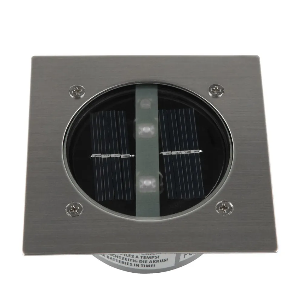 Lugo LED nedgravningsspot med solcelle – kan køres over op til 1250 kg Moderne i design og robust i sin finish af børstet rustfrit stål og glas, sætter Lugo LED nedgravningsspot med solcellemodul på toppen lyse accenter overalt på ejendommen. Solcellemodulet oplader de to genopladelige batterier i løbet af dagen, som så forsyner LED’erne med strøm i de mørke timer. Inkluderet i leveringen: 2 x AAA genopladelige batterier.