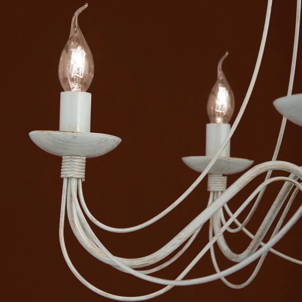 Denne lysekrone består af metal, hvad dog ikke betyder, at den har et optisk fokus. Tværtimod! Det blødt svungne stel virker med de mange arme meget fint og passer optimalt til landhusstilen. Vindstøds kertepærer med E14-fatning virker helt fortryllende. Pærerne er ikke omfattet af leveringen. De kan bestilles ekstra under Tilbehør.
