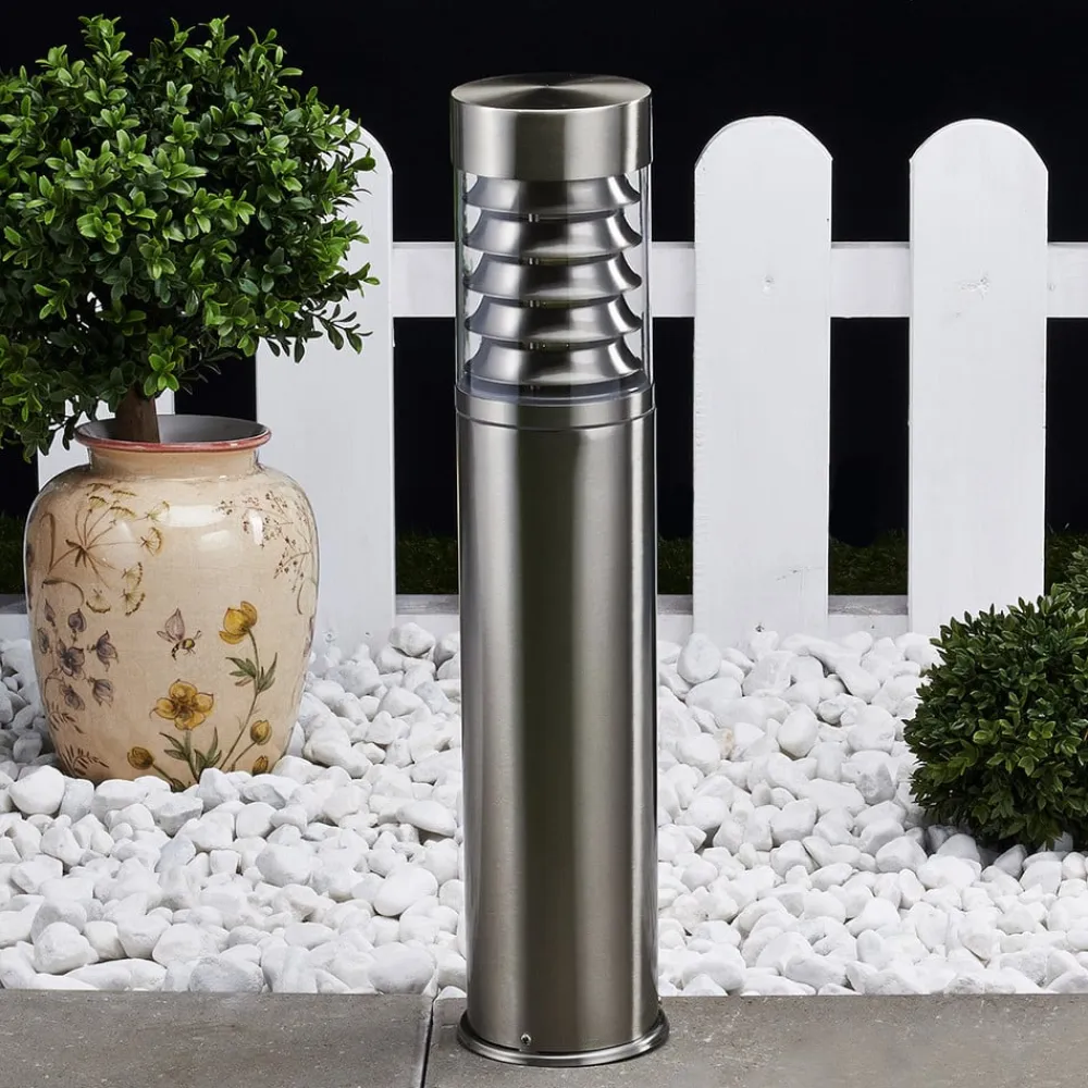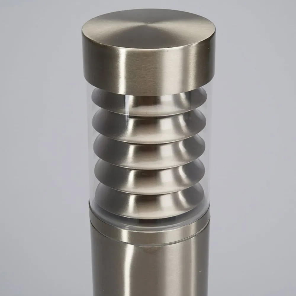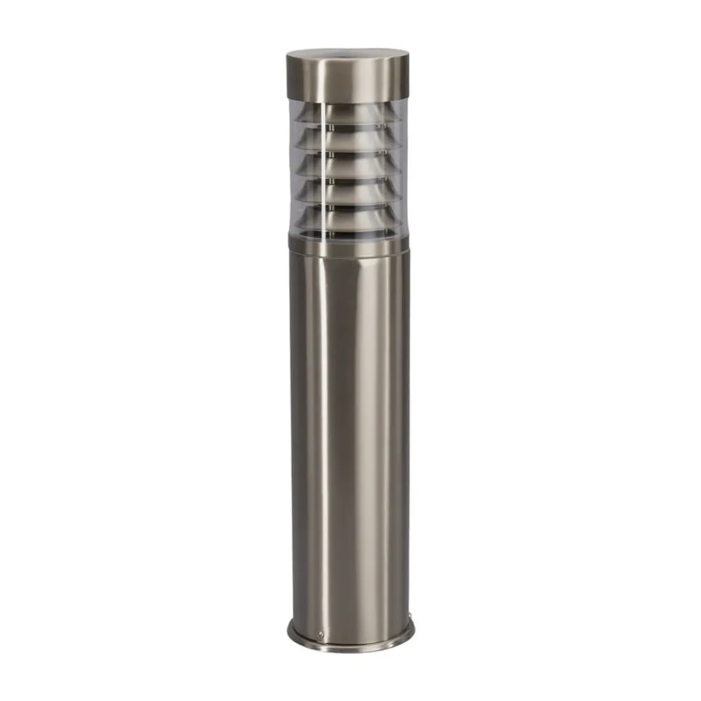 Den rørformede Enja sokkellampe har et moderne udtryk takket være den sølvfarvede overflade i rustfrit stål. I den øverste del findes lampen i polycarbonat. Der kan anvendes pærer med fatning E27 op til maks. 15 watt, og lamellerne under det klare polycarbonatelement reducerer blændingen fra lampen til et minimum, så det fremkomne lys opleves som meget behageligt. En dekorativ lyskilde til udendørs brug!
