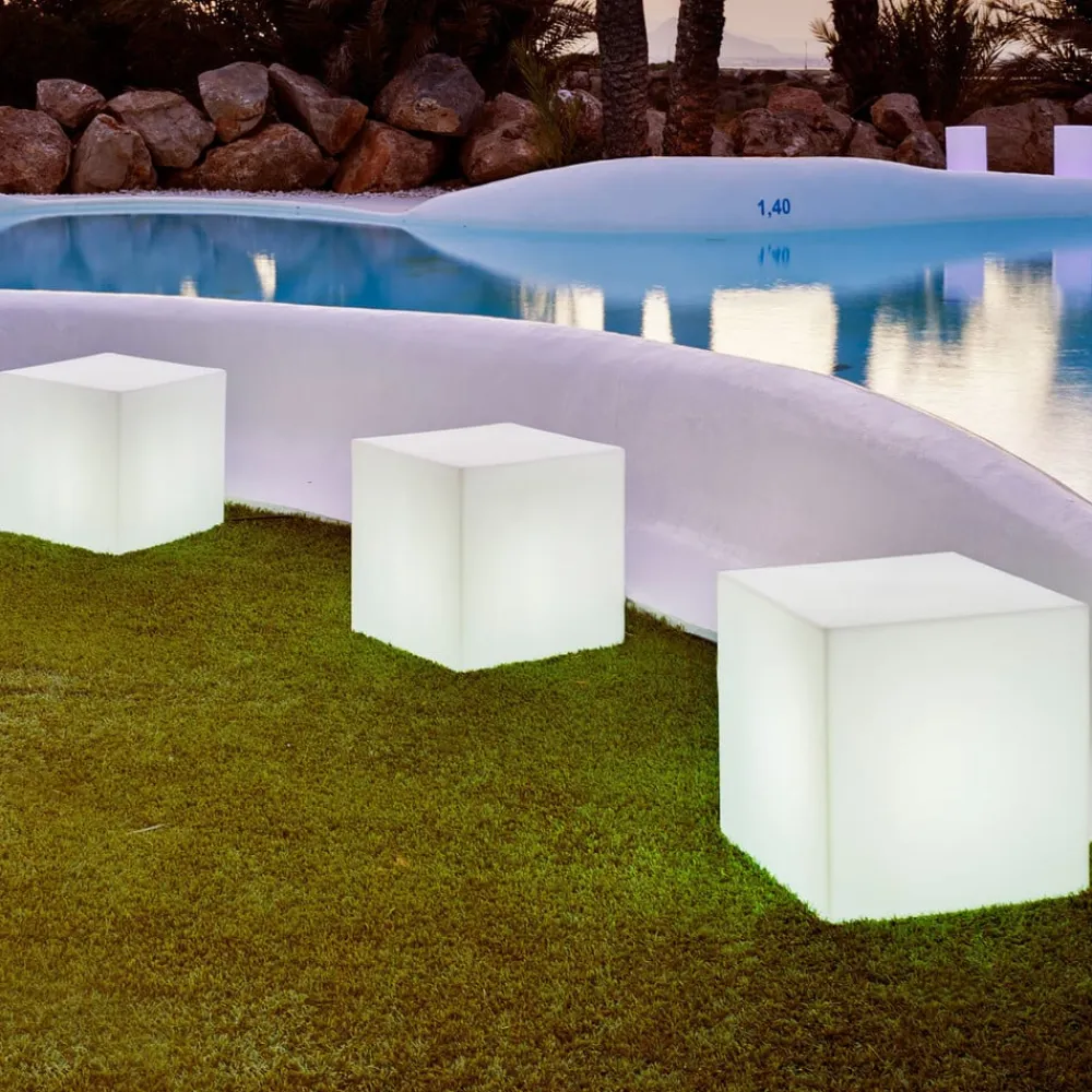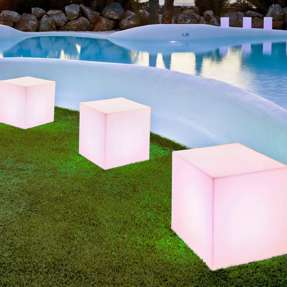 Cuby terningformet solcellelampe med batteri og ladekabel En lysende terning – det er Cuby solcellelampen fra Newgarden. Den lysende krop er lavet af gennemsigtig polyethylen, et materiale, som næsten alle Newgardens lygter er lavet af, og som er kendetegnet ved sin modstandsdygtighed over for ekstreme temperaturer og UV-bestandighed. Takket være kapslingsgraden på IP65 er der intet i vejen for at bruge den udendørs. Den lysende kube er udstyret med RGB-lysdioder og hvide lysdioder, så den kan belyses i en af utallige klare farver samt i lysfarven varmhvid. Indstillingerne foretages ved hjælp af den medfølgende fjernbetjening. Armaturets batteri kan oplades i sollyset uden omkostninger ved hjælp af det integrerede solpanel. På dage, hvor der ikke er nok sollys, kan batteriet også oplades i stikkontakten ved hjælp af det medfølgende ladekabel for at sikre en lang belysningstid om aftenen. Cuby-lyskuben er et produkt fra den spanske armaturproducent Newgarden. Newgardens produktportefølje spænder fra en bred vifte af armaturer til indendørs og udendørs brug til lysende urtepotter og lysende møbler. Næsten alle producentens produkter er lavet af polyethylen, en plast, der ikke kun er 100 % genanvendelig, men også meget robust – Inkluderer opladningskabel og fjernbetjening