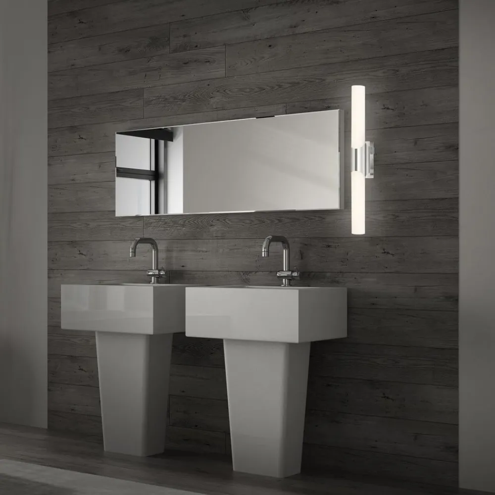 LED-badeværelses- og spejllampe med universalhvidt lys Den smarte Klak Brilo LED-badeværelses- og spejllampe har to cylindriske lampeskærme i plast, der er forbundet med et kromfarvet metalvægbeslag. Klak Brilo er udstyret med universalhvide LED’er og giver en god, blændfri belysning. Takket være kapslingsgraden IP44 er LED-lampen også tilstrækkeligt beskyttet mod vandsprøjt, hvilket betyder, at den nemt kan installeres i badeværelser eller andre fugtige rum. Den kan monteres enten vandret over spejlet eller lodret til højre og venstre for spejlet.