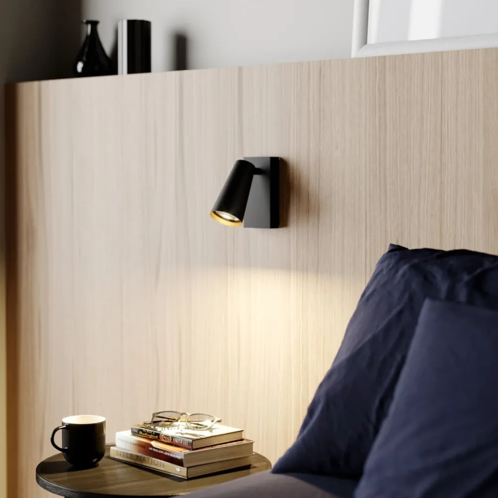 Stilfuld Angelina-spotlight med kopformet skærm i sort og guld Angelina er ideel til vægmontering og er en spotlight, der udelukkende er fremstillet af metal. Vægbeslaget er kantet, og skærmen er kopformet, med ydersiden af skærmen, ligesom rammen, i sort og indersiden af den smalle skærm i en smuk guldtone, som står i harmonisk kontrast til den sorte finish og også skaber et hyggeligt lysudslip. Metalskærmen kan også drejes efter behov for at rette lyset bedre ind. Spotlighten er designet til brug med en LED-pære og kan også monteres i loftet.