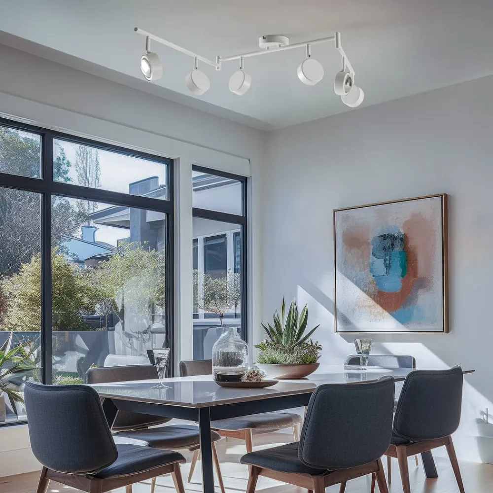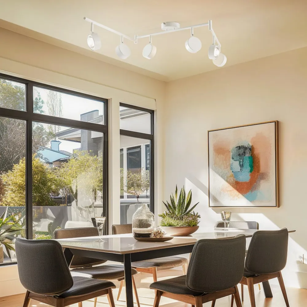 Dæmpbar Jyla-spotlight med seks justerbare skærme Jyla-loftspotten med seks lys er lavet af jern, og dens hvide ydre giver omgivelserne et elegant præg. Samtidig passer den ubesværet ind i forskellige boligområder takket være sit diskrete design. Den er f.eks. ideel som lyskilde i entreen, køkkenet, stuen eller spisestuen. Rammen kan justeres tre steder, og de runde skærme kan også vippes og drejes fleksibelt. Det gør det muligt at tilpasse lyset og belyse rummet optimalt. De medfølgende GX53-lyskilder har en buet linse og ligner derfor halvkugler af glas. Lyset kan tændes og slukkes som sædvanligt med en vægkontakt. Takket være 3-trins dæmpningsteknologien med integreret slukkefunktion kan den også dæmpes til tre forskellige lysstyrkeniveauer ved at trykke flere gange på kontakten: 100 %, 50 % og 25 %.