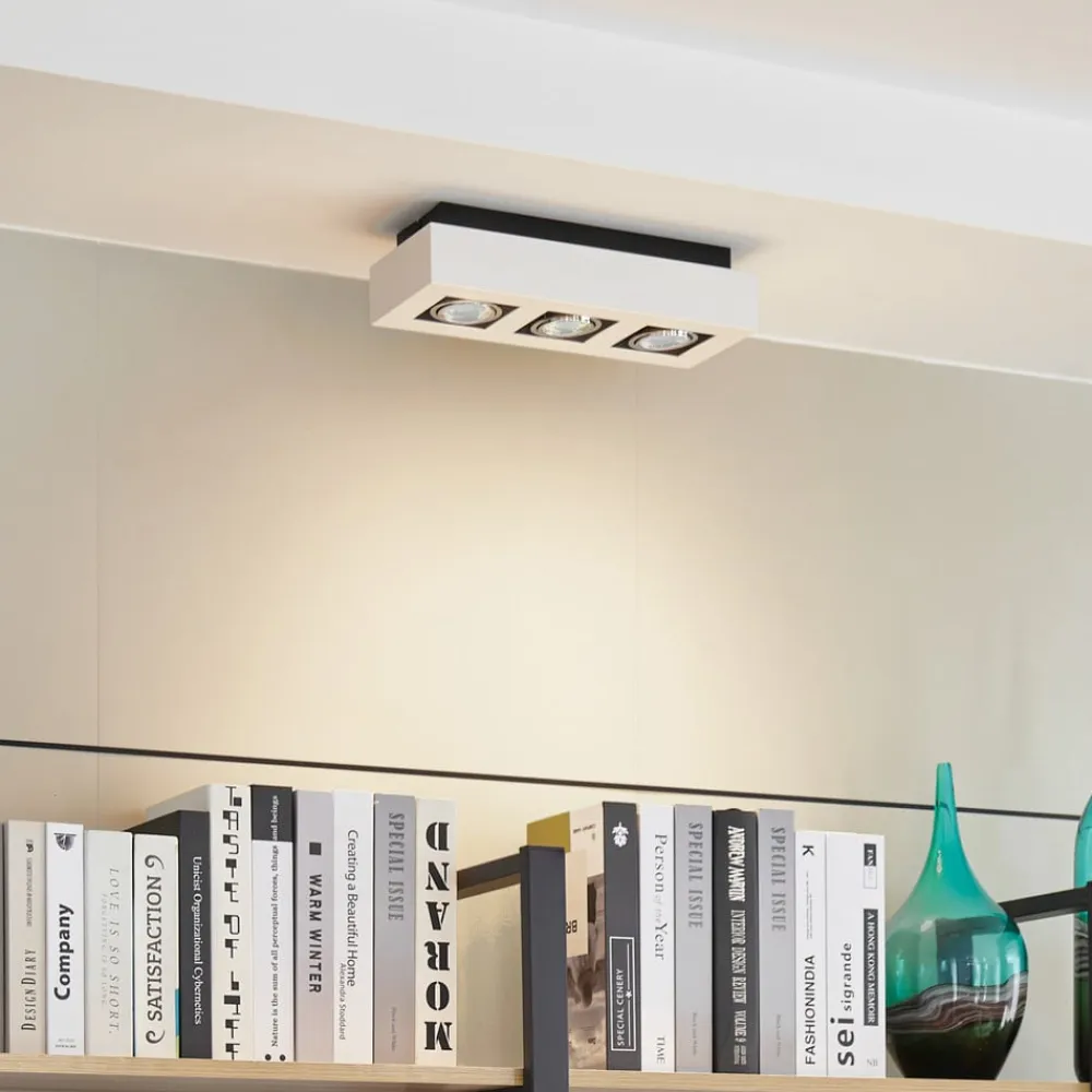 Vince kantet loftlampe med hvid overflade og justerbare indsatser Aflang i formen, kan monteres med tre GU10-lamper, Vince loftlampen er velegnet til mange anvendelser og opnår et passende lysniveau. Hver pæreindsats kan drejes efter behov, så lysets retning kan ændres. Metalrammens hvide finish skaber en særlig tidløs kvalitet – med skrueløs lynkobling af høj kvalitet (holdbar, sikker og værktøjsfri fjedermekanisme)