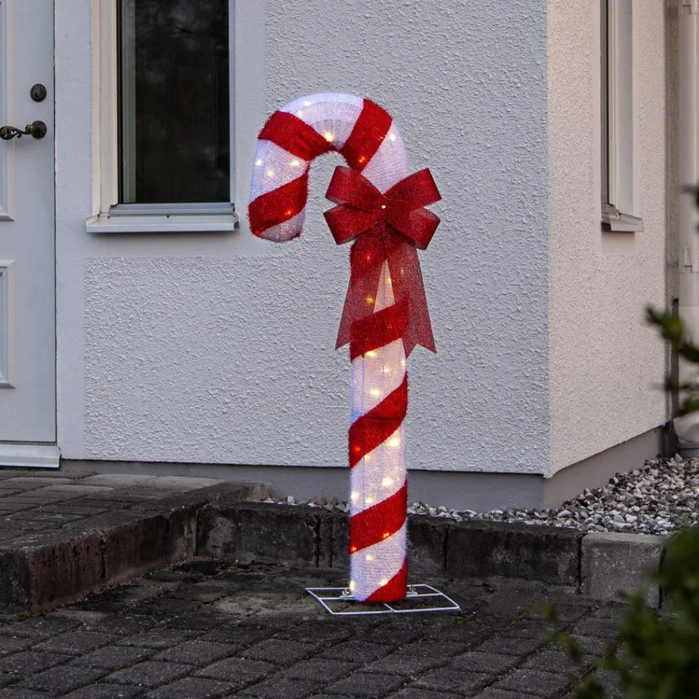 Rød og hvid Candycane LED-dekorationsfigur Candycane LED-figuren er en juledekoration baseret på den amerikanske model, designet til brug i beskyttede udendørs områder. Candycane er designet som en overdimensioneret, rød og hvid candy cane med sløjfe og er udstyret med i alt 50 varmhvide lysdioder, som også sætter figuren i scene. Den betjenes via et 5 meter langt kabel med en stænksikker plug-in-transformer.