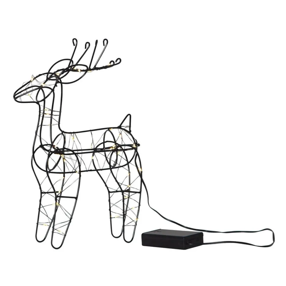 Indy LED-figur – stemningsfuldt dekorationslys til indendørs brug Indy er et stiliseret rensdyr i metal, som er smukt oplyst af mange varmhvide LED’er. Hvis du placerer den lille LED-figur på f.eks. en kommode eller et bord, kan du på ingen tid skabe en fantastisk julestemning. Der kræves ingen nettilslutning i nærheden. Indy kører på batterier. Udstyret med kontakt – 3 x AA-batterier (medfølger ikke, kan bestilles via tilbehør)
