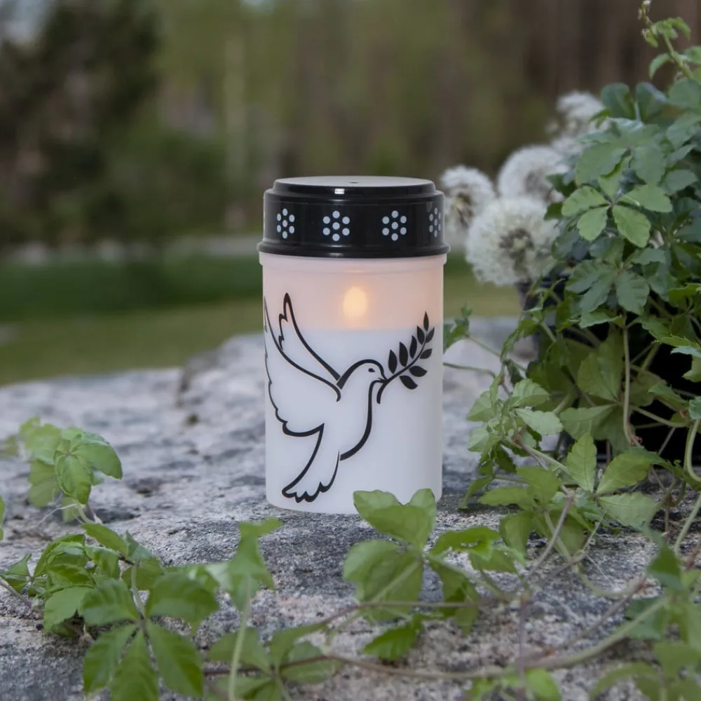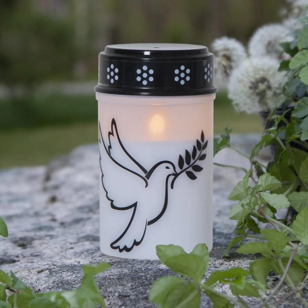 LED gravlys Dove med timerfunktion Dove er især beregnet til gravudsmykning. Det cylinderformede LED-gravlys er udformet som et klassisk gravlys med en hvid plastkrop og et sort dæksel. Motivet af en sort fredsdue pryder ydersiden. Det stænktætte (IP44) LED-gravlys kan bruges permanent udendørs og er batteridrevet (2 x C, eksklusivt). Timerfunktionen (6 timer tændt, 18 timer slukket) muliggør automatisk skift.