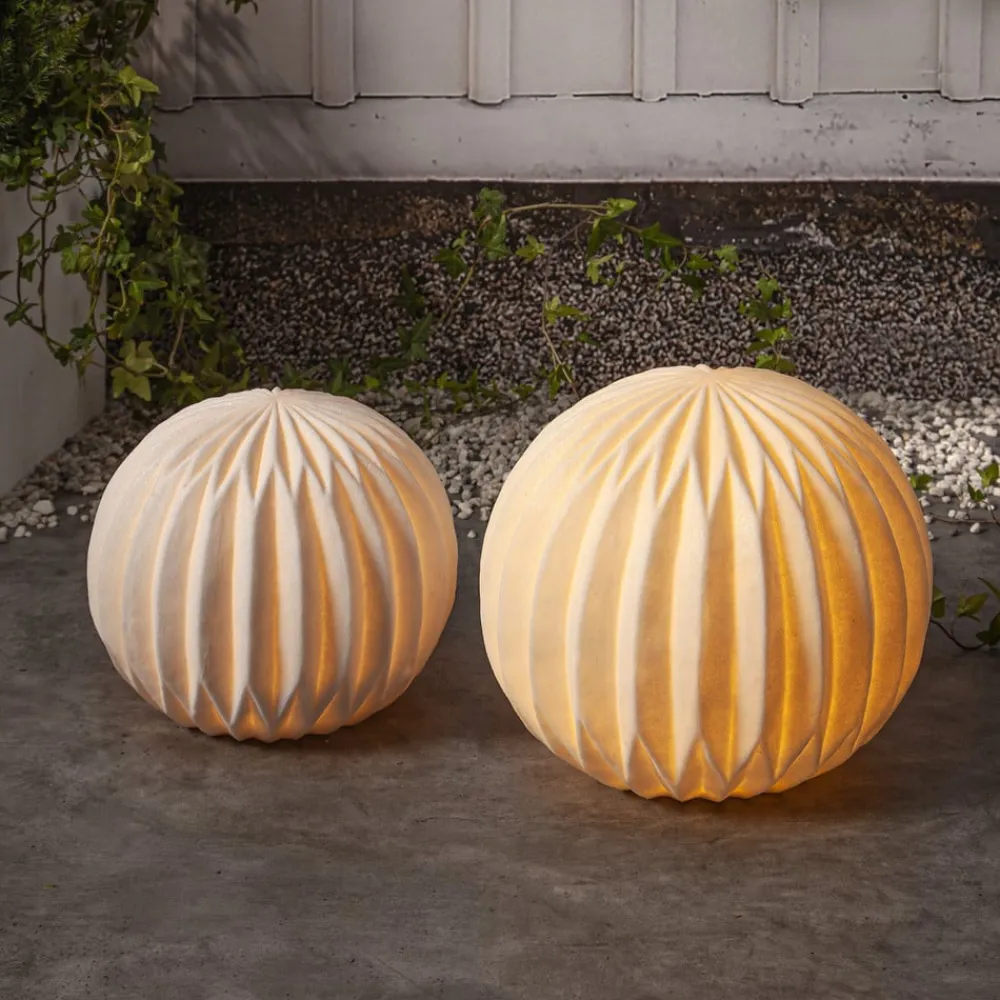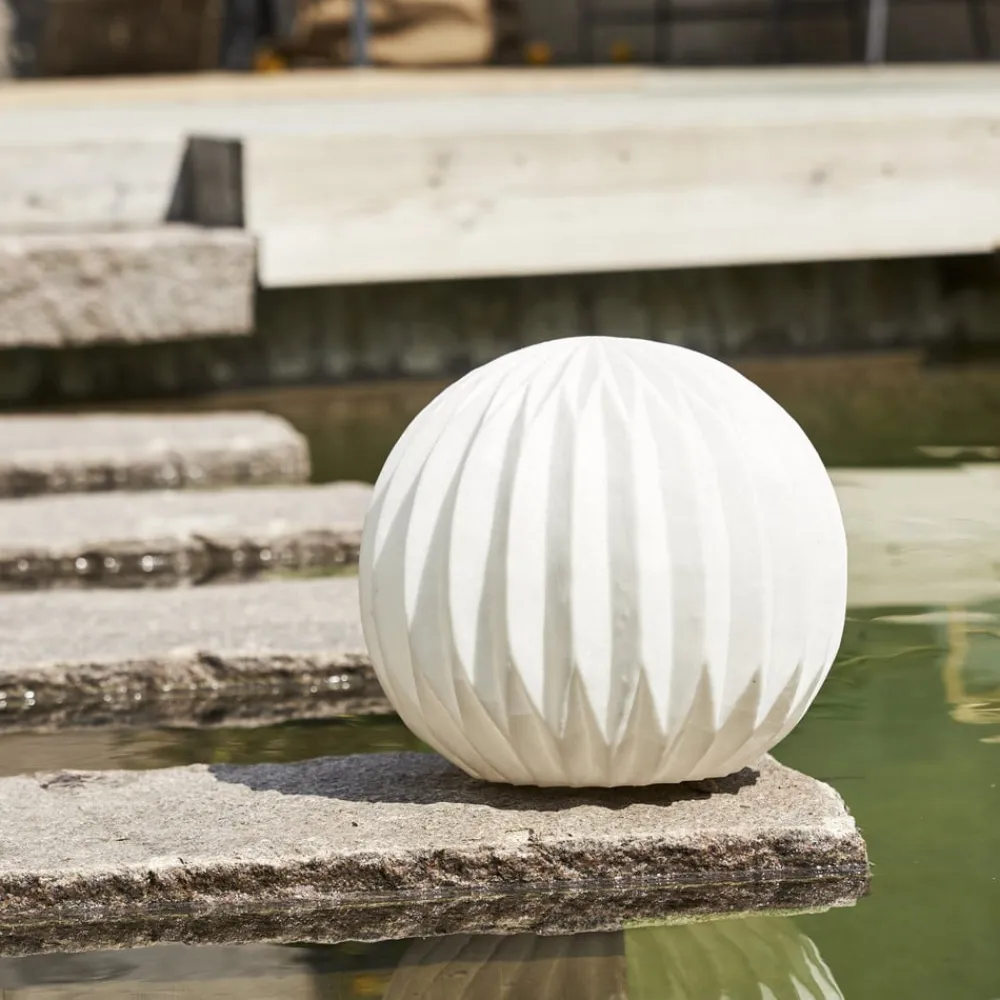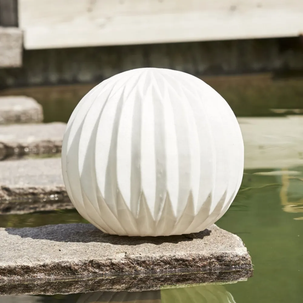 Dekorativ LED-terrasselampe Sandy med hvid lampeskærm Den hvide LED-udendørslampe Sandy er næsten kugleformet med en bølget overflade. Det anvendte materiale er polystone, som er lavet af en blanding af sand og kunstharpiks. Sandy kan bruges som dekorationslampe på terrassen og altanen samt i haven. Den drives af tre AAA-batterier (eksklusive). Timerfunktionen (6 timer tændt, 18 timer slukket) gør det muligt at skifte automatisk.