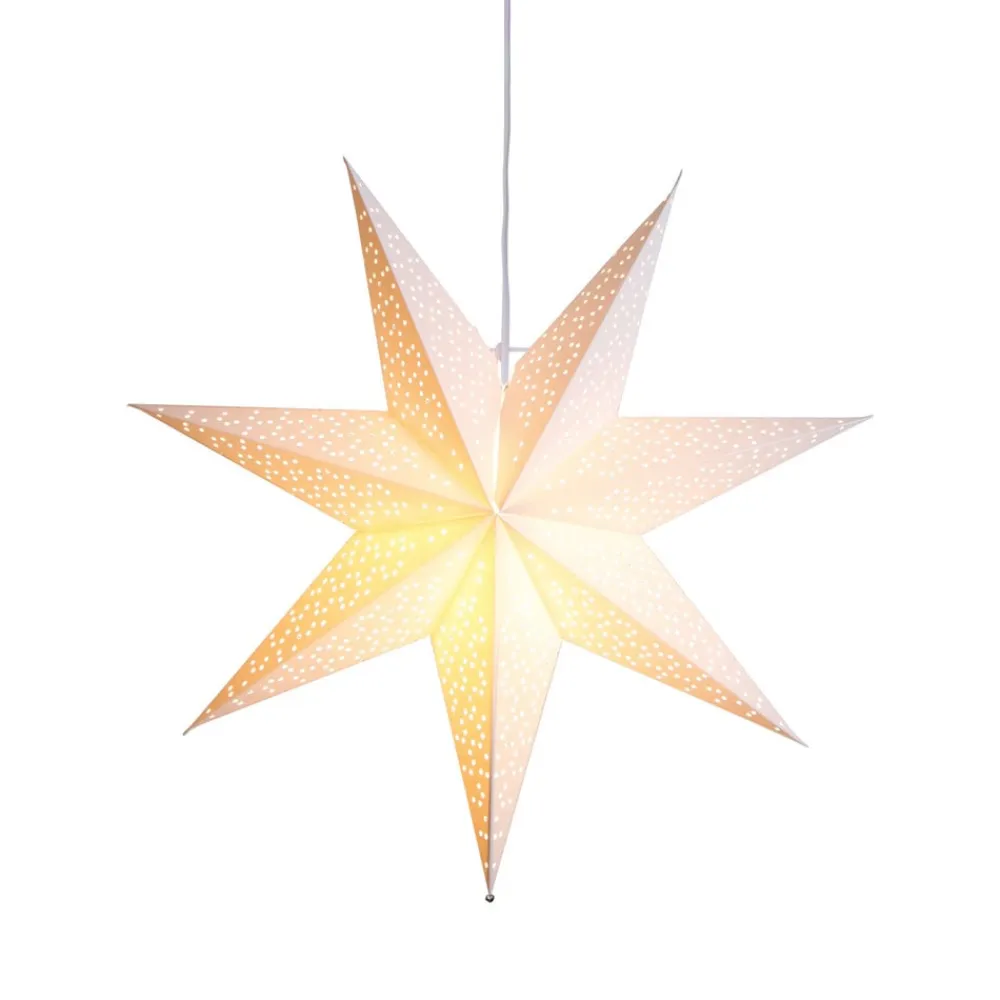 Hvid papirstjerne Dot med indviklet hulmønsterDot er det helt rigtige dekorative tilbehør til advents- og juletiden. Den store, syvtakkede stjerne af hvidt papir er dækket af et fint hulmønster, der giver en effektiv lysstemning, når lysene tændes. Papirstjernen Dot tilføjer en stemningsfuld festlig atmosfære til ethvert rum.