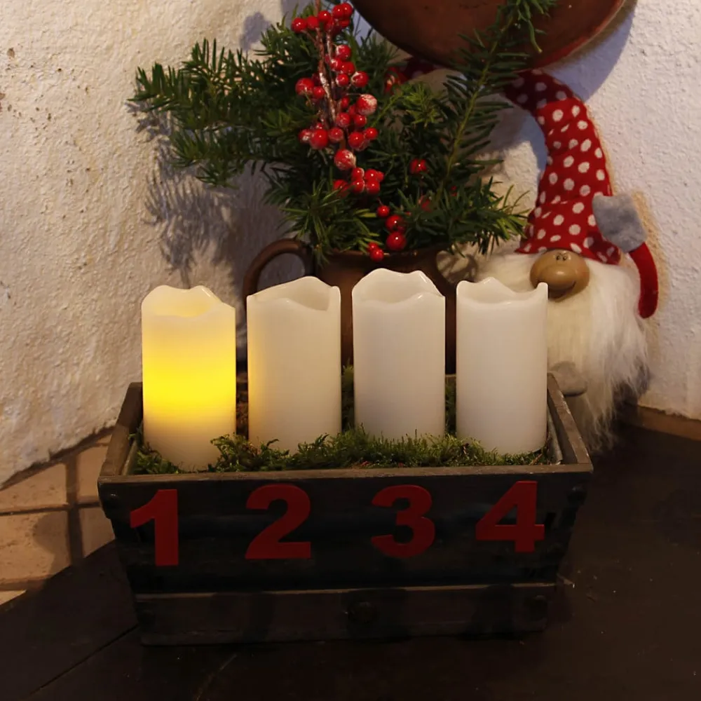 Atmosfærisk LED-lyssæt med fire flammer Stearinlys inklusive fjernbetjening Stearinlys skaber en magisk atmosfære. Men de er også forbundet med farer. Adventskranse bryder let i brand. Børn er ikke altid i stand til at vurdere effekten af åben ild korrekt. Candle LED-lyssættet er et sikkert og stemningsfuldt alternativ. LED-lysene er integreret i fire lyshylstre lavet af ægte voks. Visuelt ser LED-lysene ud præcis som svagtbrændende stearinlys. Lysesættet kan bruges til at dekorere adventskranse, især ved juletid. De kan også bruges til sikkert at skabe en atmosfærisk stemning med levende lys i offentlige faciliteter som plejehjem eller daginstitutioner. Særlig fordel: De batteridrevne LED-lys kan styres med en fjernbetjening. CR2032 knapbatterier er inkluderet i leveringsomfanget – Batteridrevet indendørs juleartikel – Batterier til fjernbetjeningen inkluderet