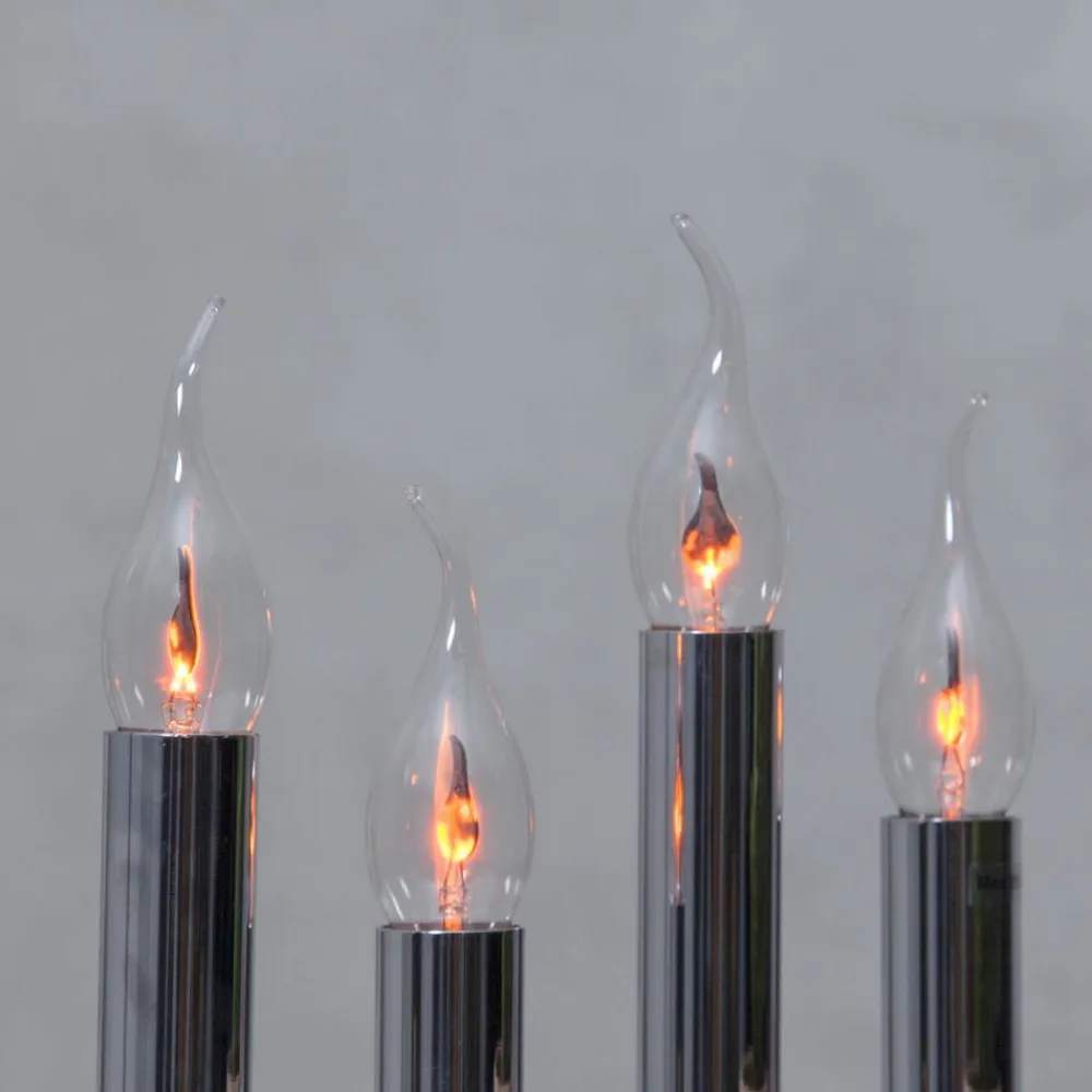 E14 3W LED-pære med flammeeffekt Denne lampe efterligner lyset fra et rigtigt stearinlys. Glasset er formet som en flamme i et vindpust og gør LED’en, som også er flammeformet, synlig. Lyset er særligt varmt og skaber en hyggelig atmosfære. De ujævne lyseffekter efterligner den flakkende flamme fra et rigtigt stearinlys. Takket være det elegante design og den effektive LED-lysliste er LED-lampen ideel til åbne armaturer og lysekroner. Egenskaber: kun beregnet til dekorativ belysning