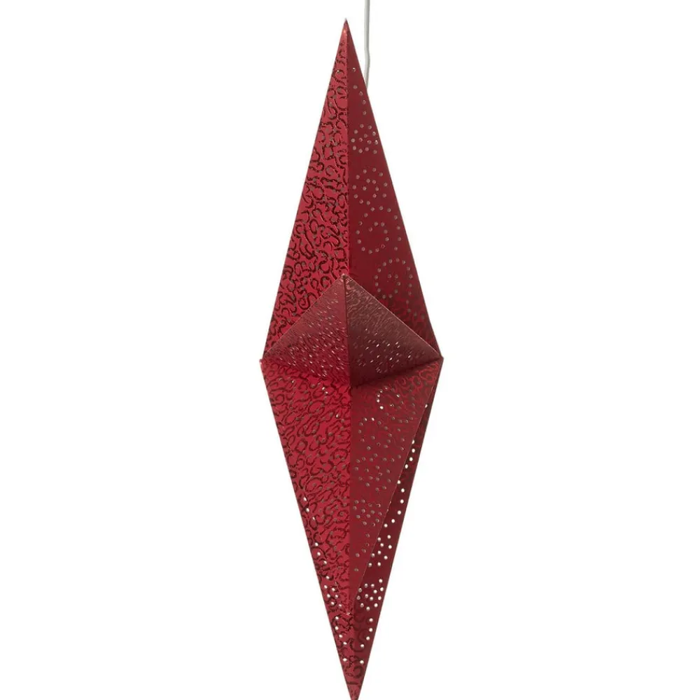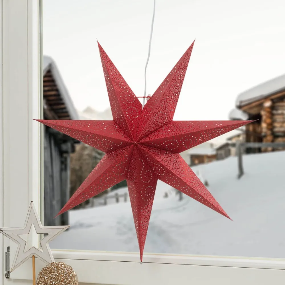 Denne stjerne med en diameter på 60 cm i rødt papir er dekoreret med et iøjnefaldende mønster af huller og leveres komplet med en 3,5 meter lang stikprop. Den antikke papirstjerne er ikke kun attraktiv i juletiden, når den kan beundres på lang afstand som en lysende vinduesdekoration. Den forskønner ethvert rum hele året rundt med sit flotte udseende.