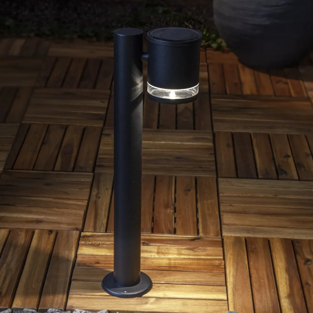 Solcelledrevet LED-sokkellampe Vienna i sort – spotlight nedad Den sorte LED-sokkellampe Vienna er ideel til orienteringsbelysning langs gangstier. Den cylindriske krop er lavet af rustfrit stål og har et hoved af aluminium. Det rummer en varmhvid LED, hvis lys sendes nedad. Vienna er helt autonom – takket være det genopladelige batteri og solcellemodulet er der ikke behov for en strømforbindelse, og takket være skumringssensoren tændes lyset automatisk.