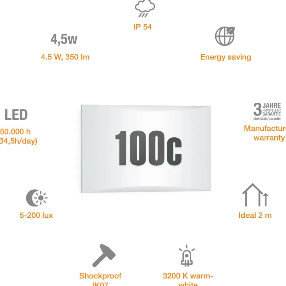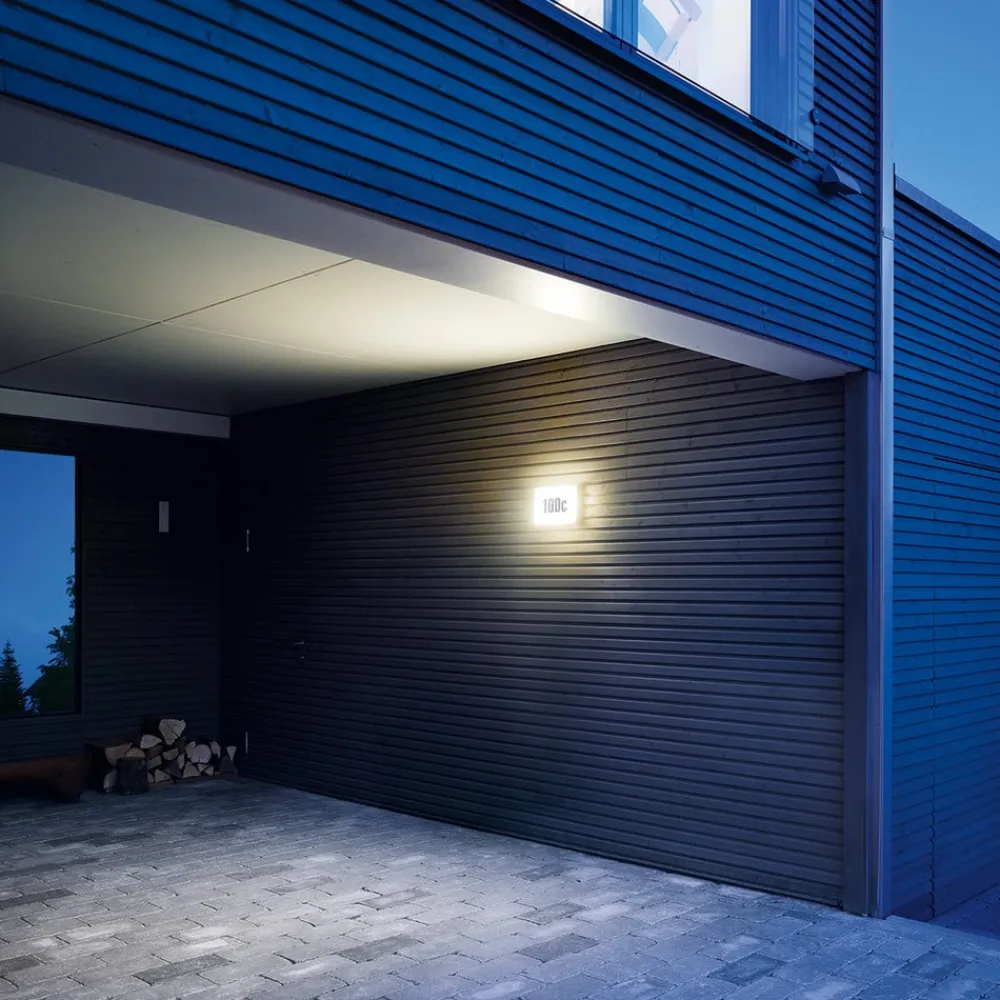 L 1 N LED udendørs vægarmatur kombinerer et usædvanligt elegant design med høj funktionalitet. Med sin ekstremt flade form er den et blikfang i enhver installationssituation og giver perfekt belysning om aftenen fra den indstillede skumringsgrænse. Armaturet slukker derefter automatisk ved daggry. Der medfølger selvklæbende husnumre og bogstaver.