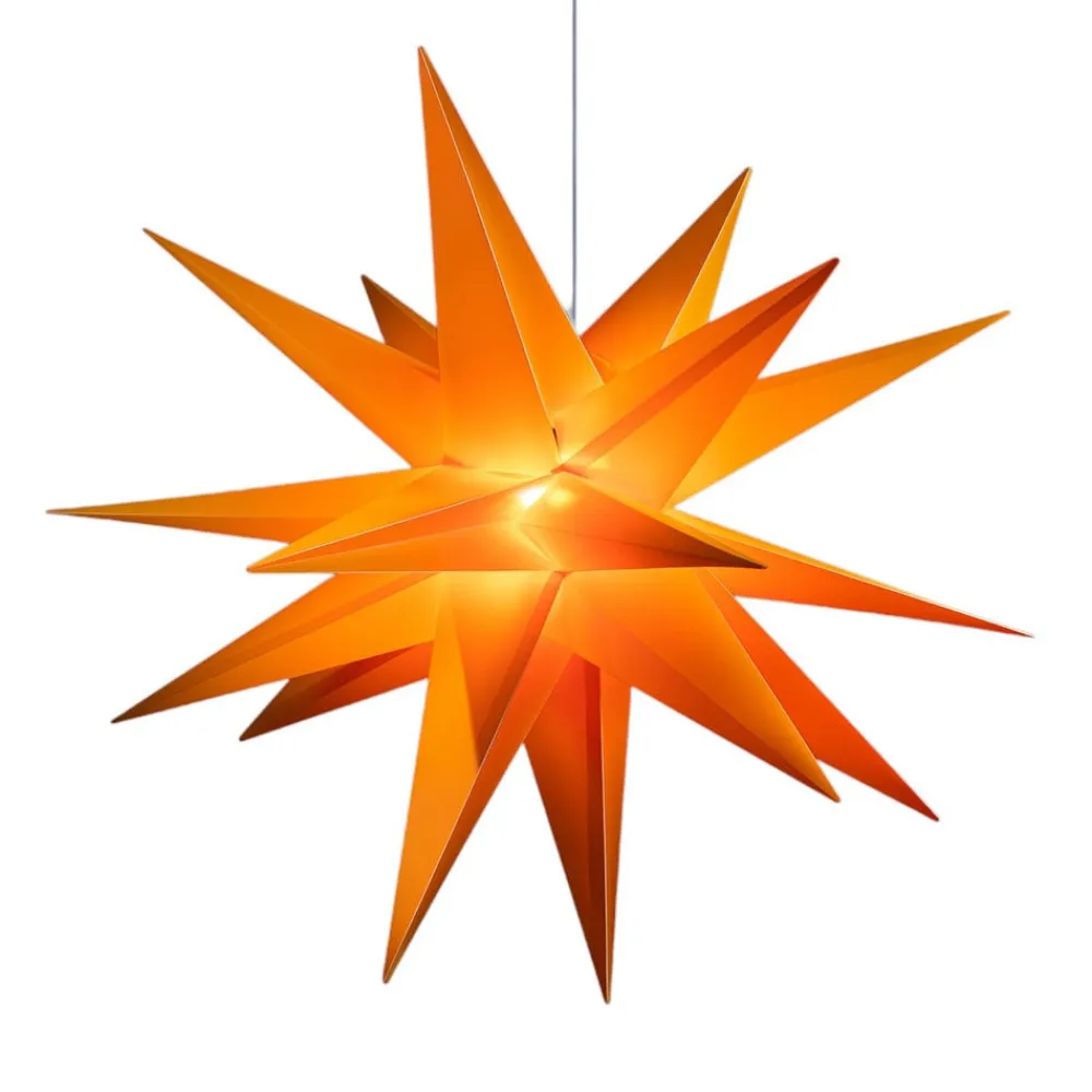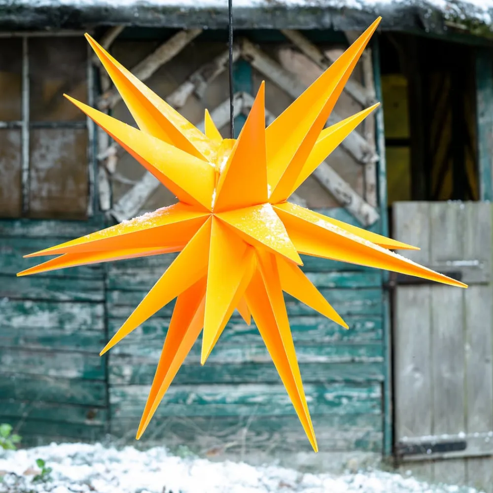 Denne 18-punktet stjerne er ideel til udendørs brug på grund af dens IP44-beskyttelsesklasse, da den er beskyttet mod vandstænk på alle sider. Designet er helt overbevisende, og selv når den er slukket, stråler den med sin rige gule farve. Når lyset tændes om aftenen, er det synligt på lang afstand og præsenterer sig selv som en juledekoration, der skaber en stemningsfuld atmosfære. Udstyret med et 4 meter langt forsyningskabel.