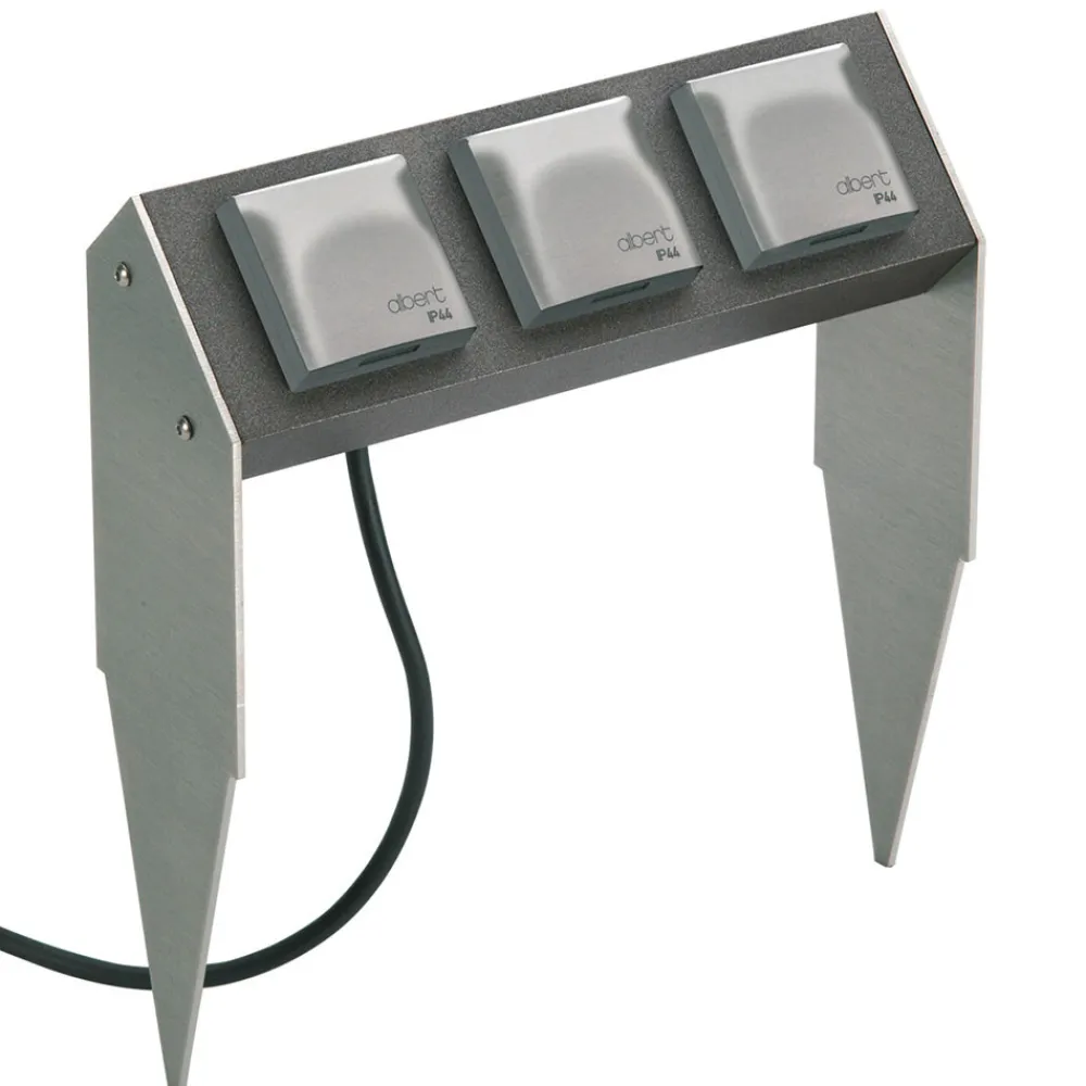 Tredobbelt stikkontaktstang 4403 – kan placeres overalt takket være jordspyd Stikkontaktstangen 4403, der er lavet af aluminium og rustfrit stål, har tre integrerede stikkontakter. Det gør det lettere at bruge elektriske apparater i haven. Udstyret med et 250 cm langt netkabel med stik.