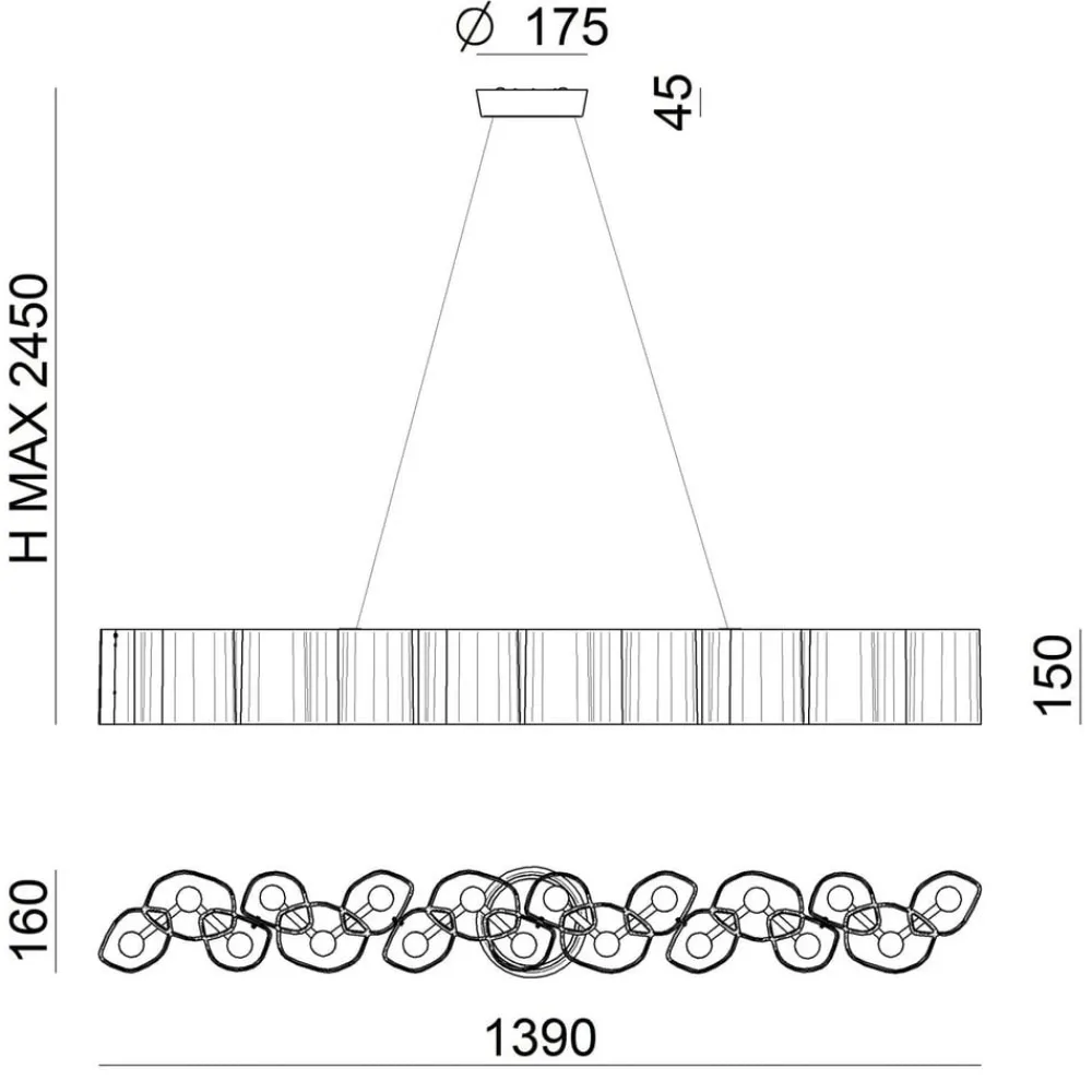 Når Honey-pendellampen er slukket, forbliver den ret diskret. Men så snart lampen tændes, udfolder den hele sin pragt og sætter stilfuldt fokus på rektangulære eller ovale spiseborde.