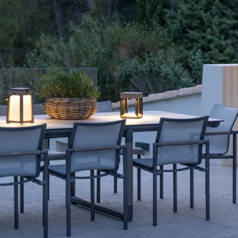 Moderne designet LED-solcellelanterne Tecka med bærehåndtag af aluminium