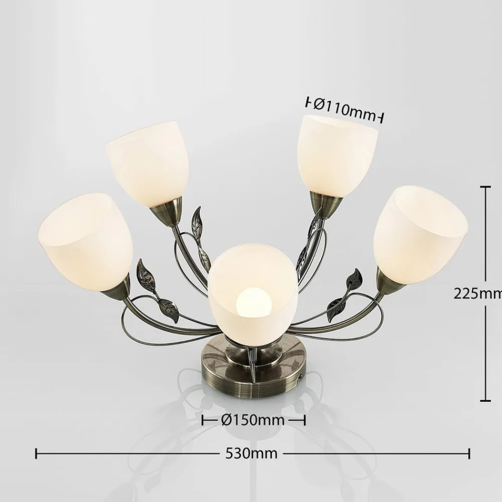 Thaddeus egner sig perfekt som en belysningsmulighed til opholdsrum i klassisk stil. Metalstellet virker sjovt og en smule antikt, for stiverne er buede og har desuden en flot altmessing-finish og en smuk bladdekoration afrunder det flotte look. De hvide lampeskærme skaber et ensartet lysskær med en hyggelig virkning og passer godt til det samlede billede. Da lampen har 5 lyskilder og E14-fatninger, kan du sikre en høj grundlæggende lysstyrke, og du kan vælge pærer efter eget ønske, f.eks. i forhold til lysstyrke, strømforbrug og lysfarve.