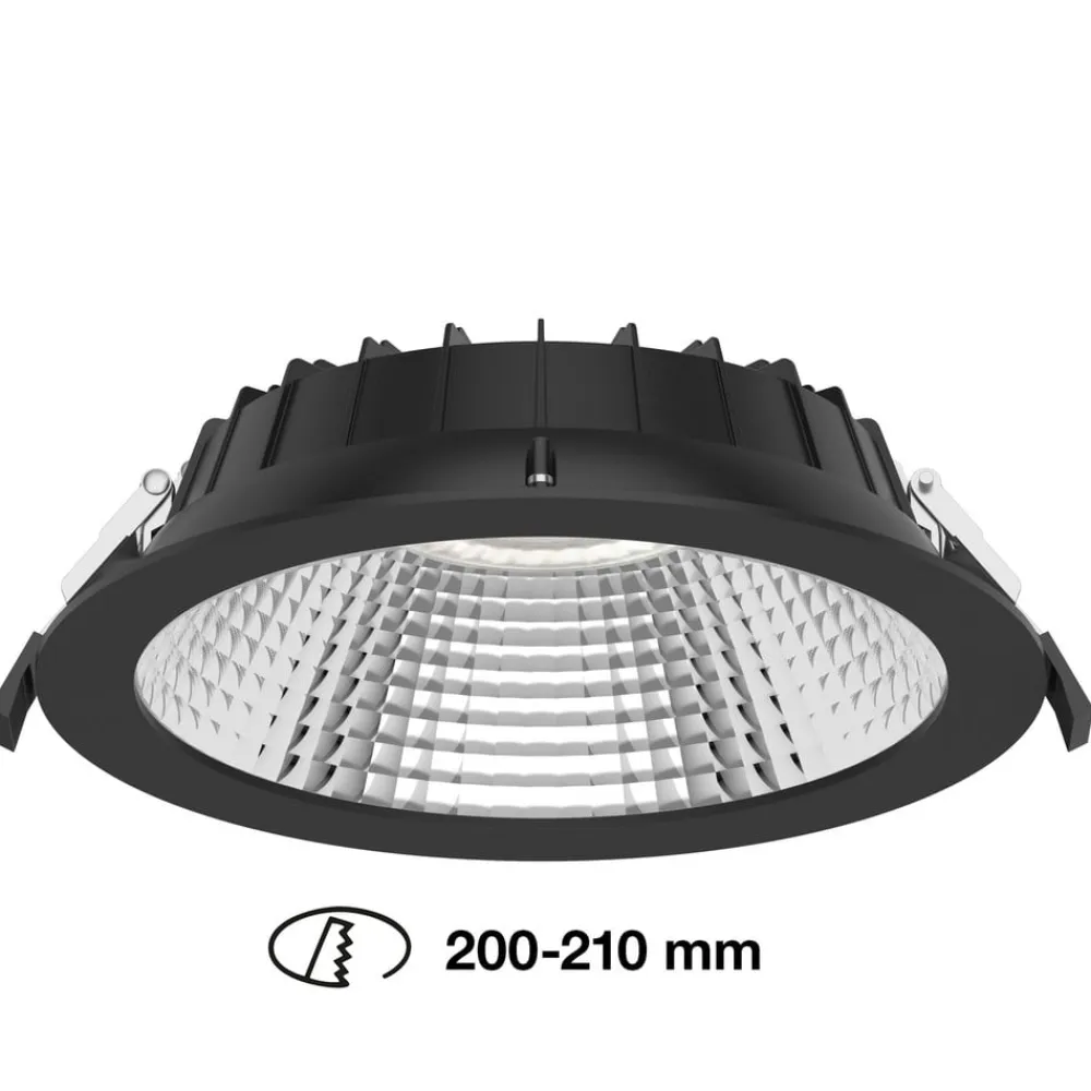 LED-indbygningsspot SLC Shift til indbygningsdiametre på 20 til 21 cm Denne LED-indbygningsdownlight er ideel til ombygning, den passer i indbygningsåbninger på 20 til 21 cm. Den højeffektive downlight udsender flimmerfrit lys og kan justeres i lysfarve (3.000 K eller 4.000 K). Med en UGR <19 er det ideelt til udskiftning af gamle armaturer i arbejdsområder, f.eks. kontorer. Med tilbehør kan armaturet også monteres som påbygningsarmatur eller bruges i større åbninger – LED-driver medfølger ikke, skal bestilles separat – 60° udstrålingsvinkel – med højglansreflektor – kapslingsklasse IP54 – nominel omgivelsestemperatur i henhold til IEC 62722-2-1: -20 til 40° C – dæmpbar med leading-edge- og trailing-edge-fasedæmpere