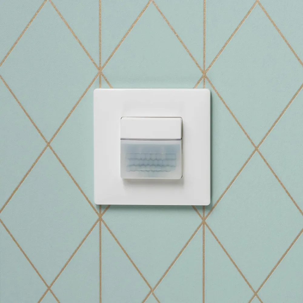 Detektoren theMura S180-100 2W UP WH (med dæksel) til indbygning i væggen skal anvendes sammen med trappebelysningstimeren fra Theben ELPA (4-tråds kredsløb), der kan kobles uden belastning.