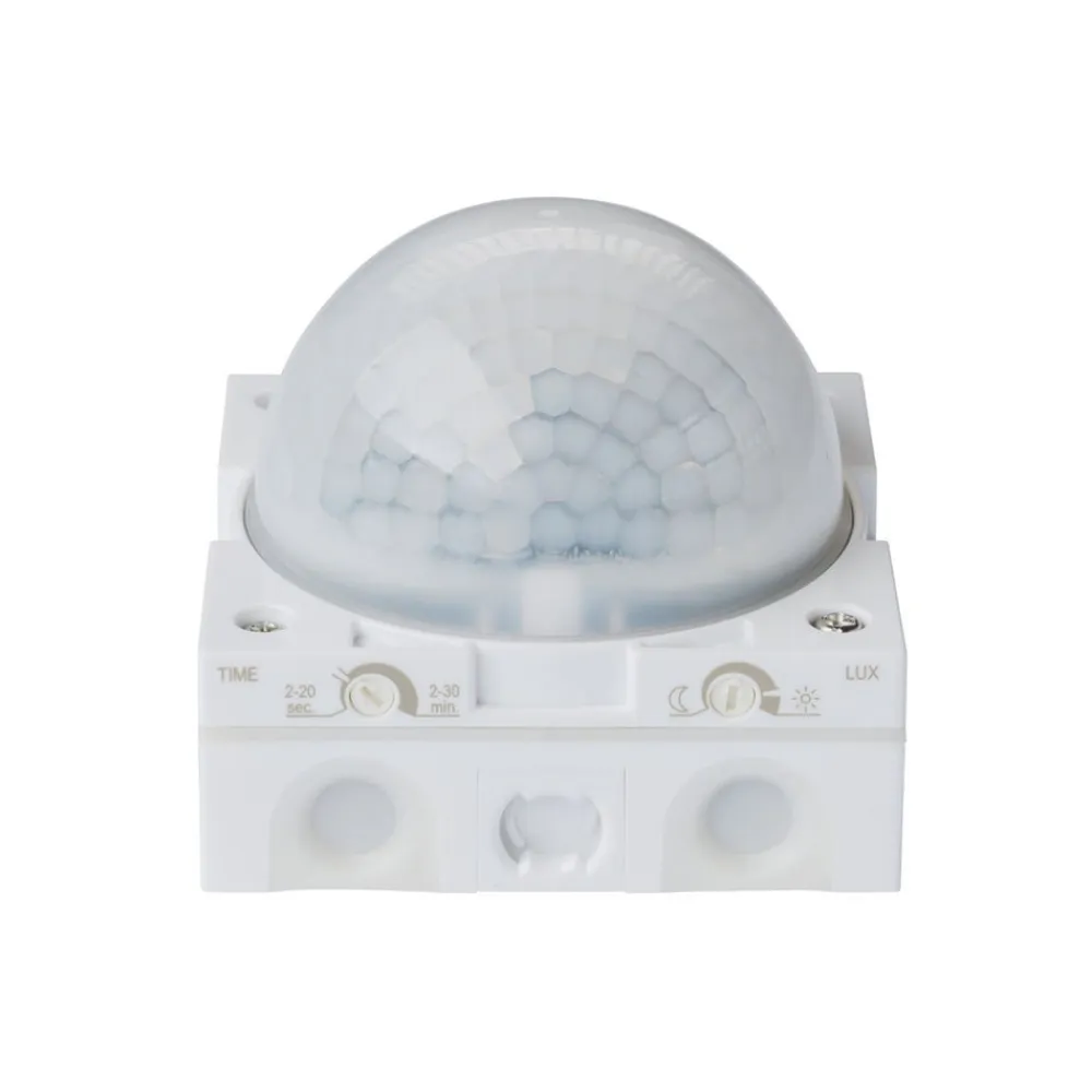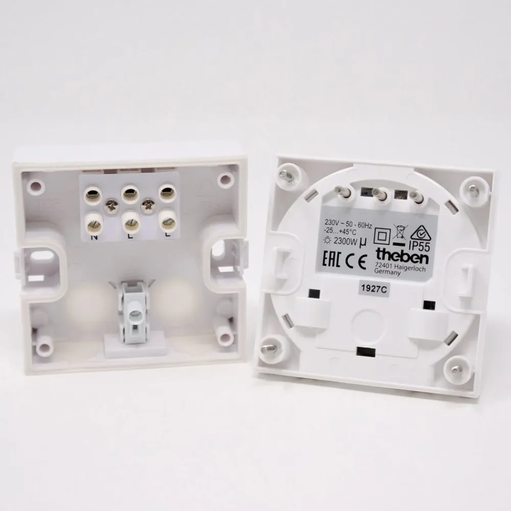 Robust bevægelsesdetektor (PIR) theLuxa R180 til udendørs brug Bevægelsesdetektoren theLuxa R180 har et robust husdesign og er beskyttet mod manipulation. Den skjulte placering af betjeningselementerne under det sikre frontdæksel bidrager også til dette. Sensoren placeres på væggen i en højde af 2,5 meter. Den kan også indbygges. Funktionerne er forudindstillede, så der ikke er noget i vejen for, at de kan tages i brug med det samme. Detekteringsområdet kan begrænses ved hjælp af den medfølgende dækclips. Inkluderer dummy-terminal til beskyttelsesjordleder – Forudindstillet – Detekteringsvinkel: 180° – Rækkevidde: maks. 12 m – Lysstyrkeindstillingsområde: 2 til 200 lux – Lysforsinkelsestid: 2 s til 30 min – Nulgennemgangskobling til relævenlig omskiftning og høje lampebelastninger – Gløde-/halogenlampebelastning: 2.300 W – Lysstofrørsbelastning (VVG) ikke parallelkompenseret: 500 VA – Lysstofrørsbelastning (VVG) parallelkompenseret: 500 W 60 µF – Lysstofrørsbelastning (VVG) seriekompenseret: 500 VA – Lysstofrørsbelastning (EVG): 500 W – Kompaktlysstofrør: 500 W – LED-lampe under 2 W: 50 W – LED-lampe over 2 W: 500 W – Omskiftningskapacitet: 10 A (ved 230 V AC, cos φ = 1)