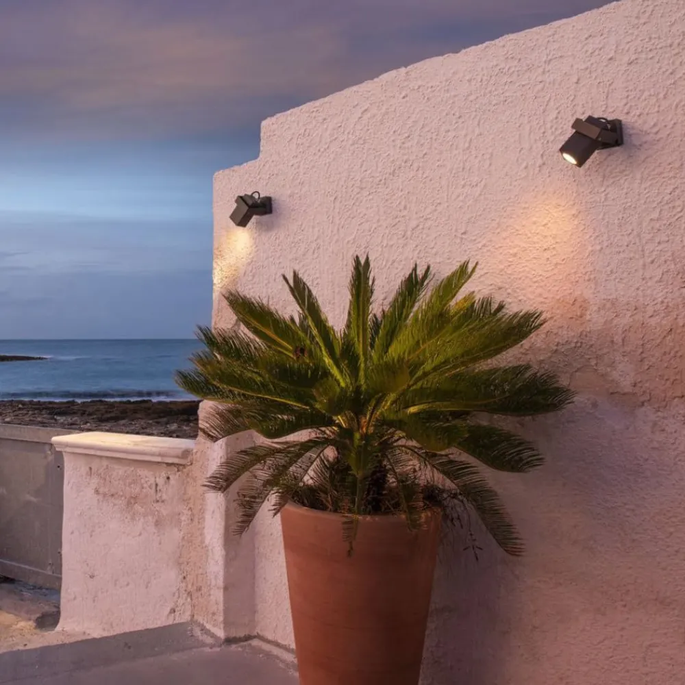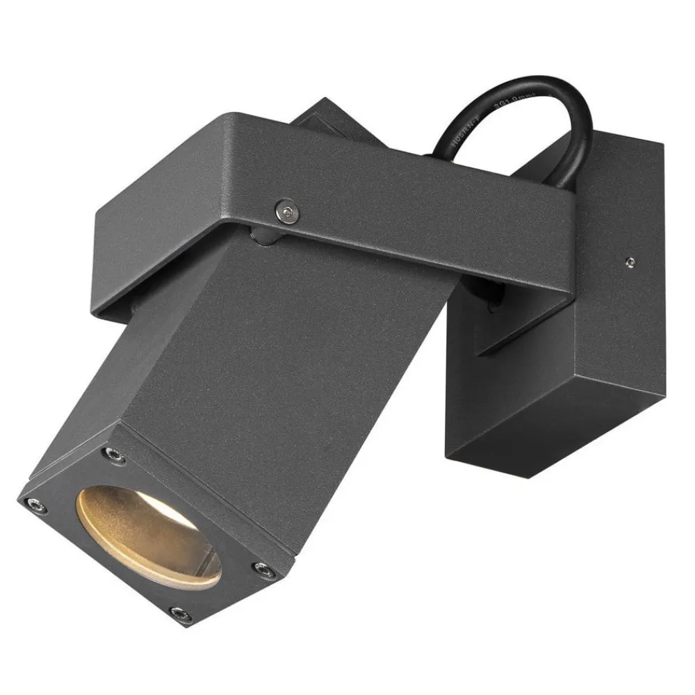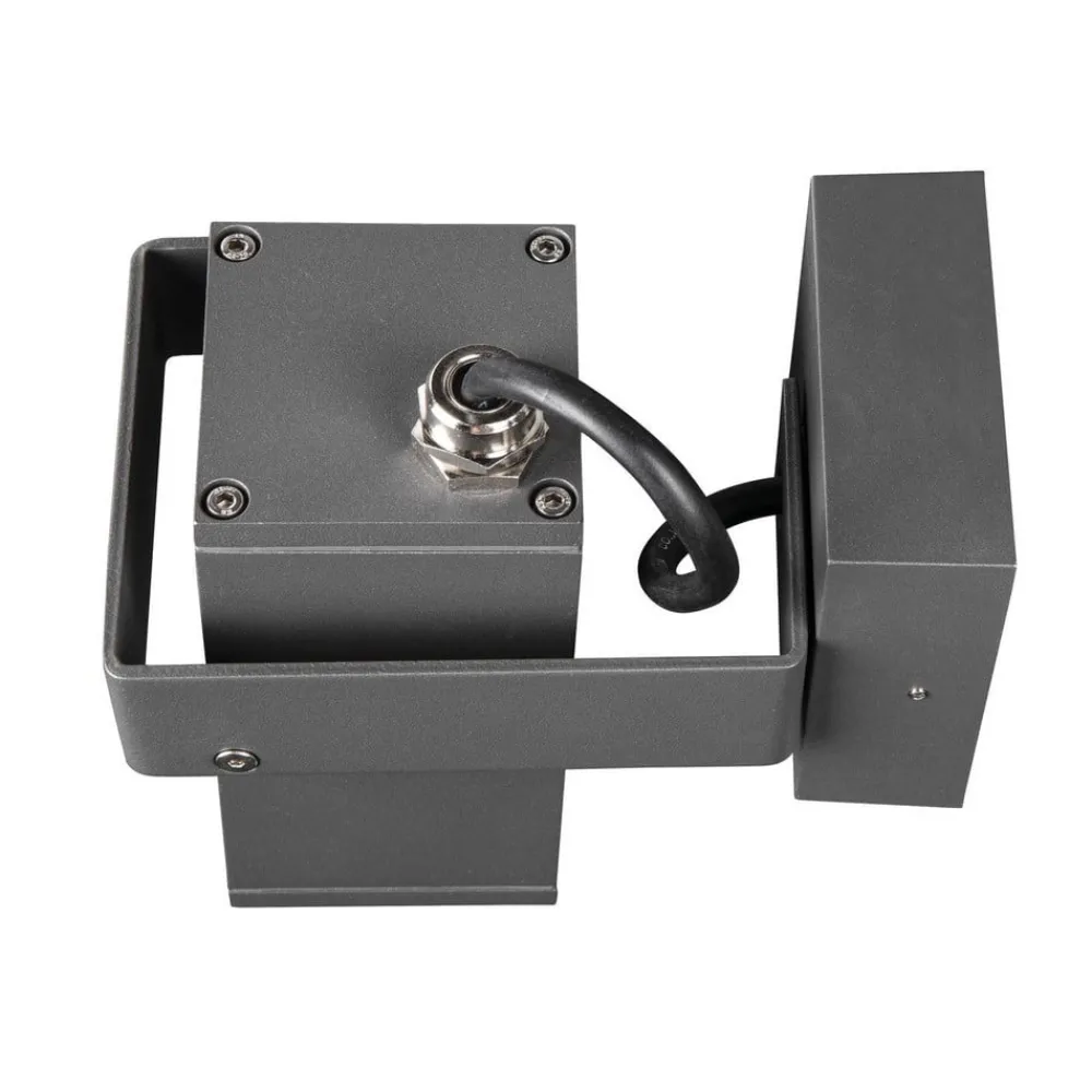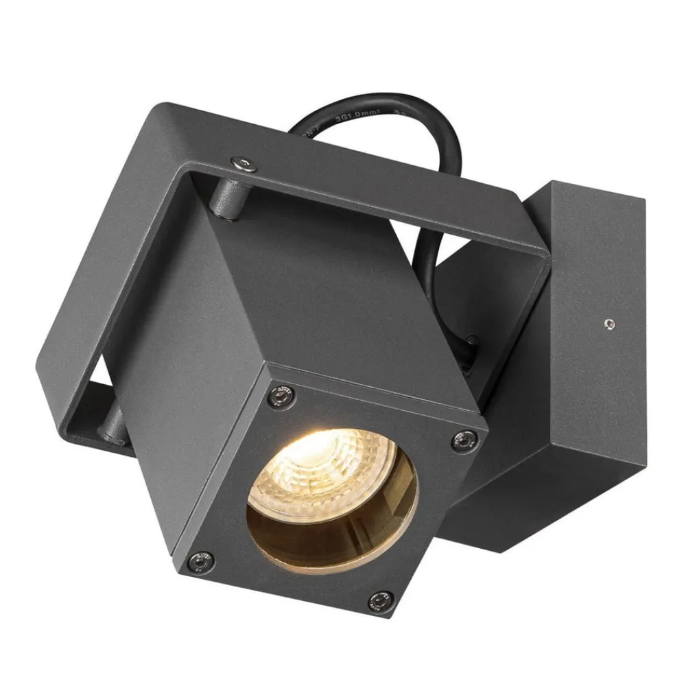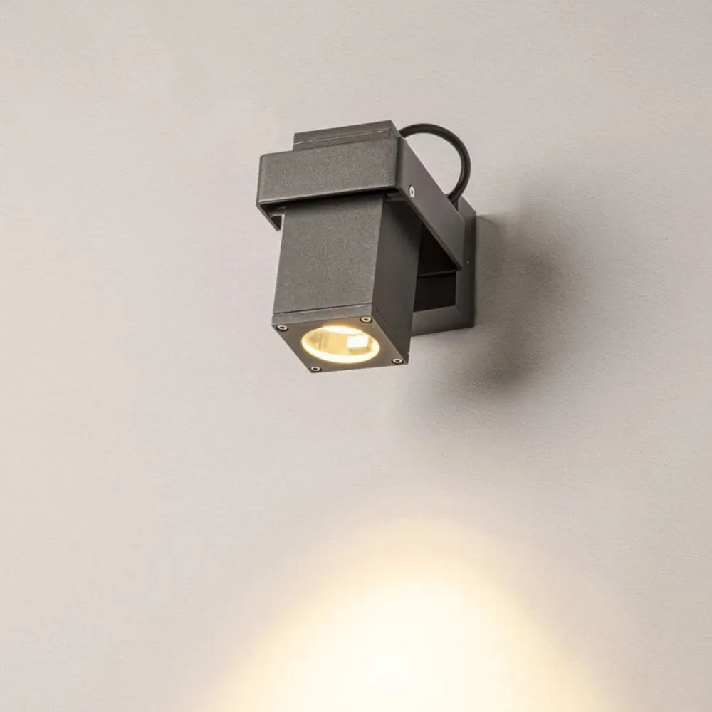 Moderne Theo Bracket udendørs vægspot med roterende og drejeligt lyshoved Monteret på husfacaden eller på et lille haveskur giver Theo Bracket udendørs vægspot en præcis belysning. Til det formål er spotlampen udstyret med både et roterende og et drejeligt lyshoved. Takket være det moderne og kantede design i antracit passer den harmonisk ind i moderne udendørsområder uden at blive for meget af et fokuspunkt. Det anbefales at bruge en LED-lyskilde til effektiv belysning (se tilbehør).
