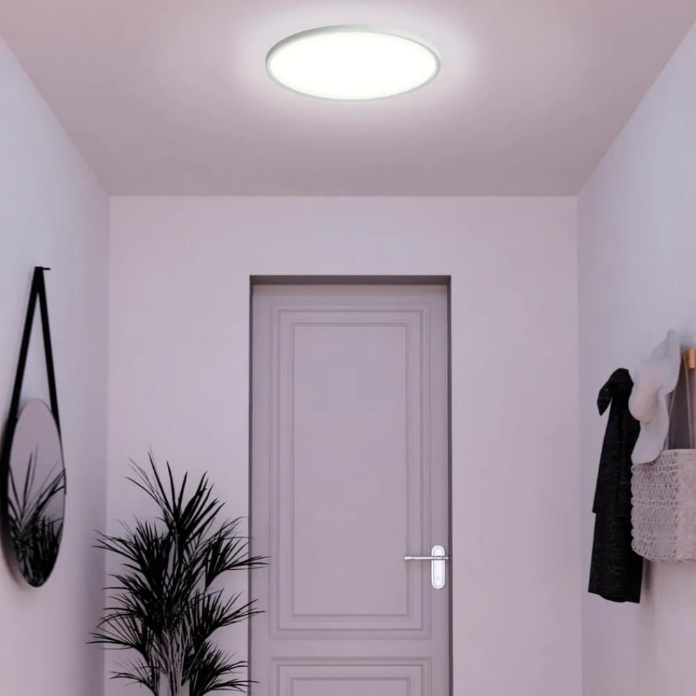 Smart, styret LED-loftlampe Amela med CCT- og dæmpningsfunktion Lyset oplyser hovedsageligt området under lampen, men spotlights også bagud, hvilket skaber en smuk indirekte lyseffekt. Alternativt er det også muligt at montere Amela som væglampe.