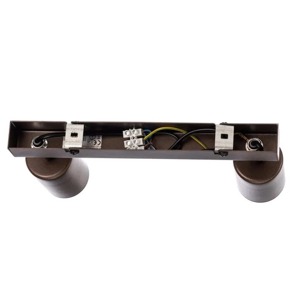 Justerbar Top loftspot med to cylindriske hoveder GU10 Top loftspot lavet af stål i en mat mørkebrun finish består af en lang baldakin og to cylindriske spotlighthoveder placeret i en række. Sidstnævnte er justerbare, så lyset kan rettes mod det ønskede område.