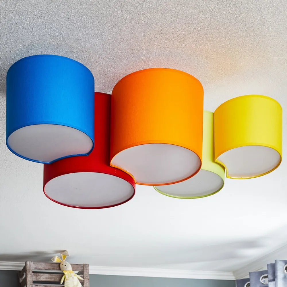 Loftlampen Mona med 5 lyskilder og flerfarvet design kombinerer moderne design med livlige farver. Lampen er fremstillet af en kombination af metal, tekstil og plast og bringer et dynamisk farvespil ind i ethvert rum. Farverne rød, orange, blå, grøn og gul skaber en unik atmosfære, der sætter accenter i både soveværelset, stuen og spisestuen.