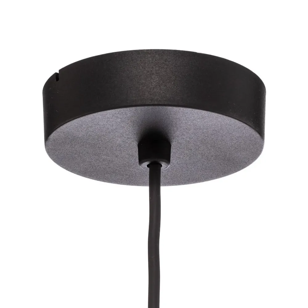 Hyggelig Trio-pendel med tre-lags jute-tekstilskærm Trio-pendlen har en flot stofskærm bestående af tre cylindriske kugler i petrol, naturbrun og orange. Ophænget med den runde baldakin er i sort.